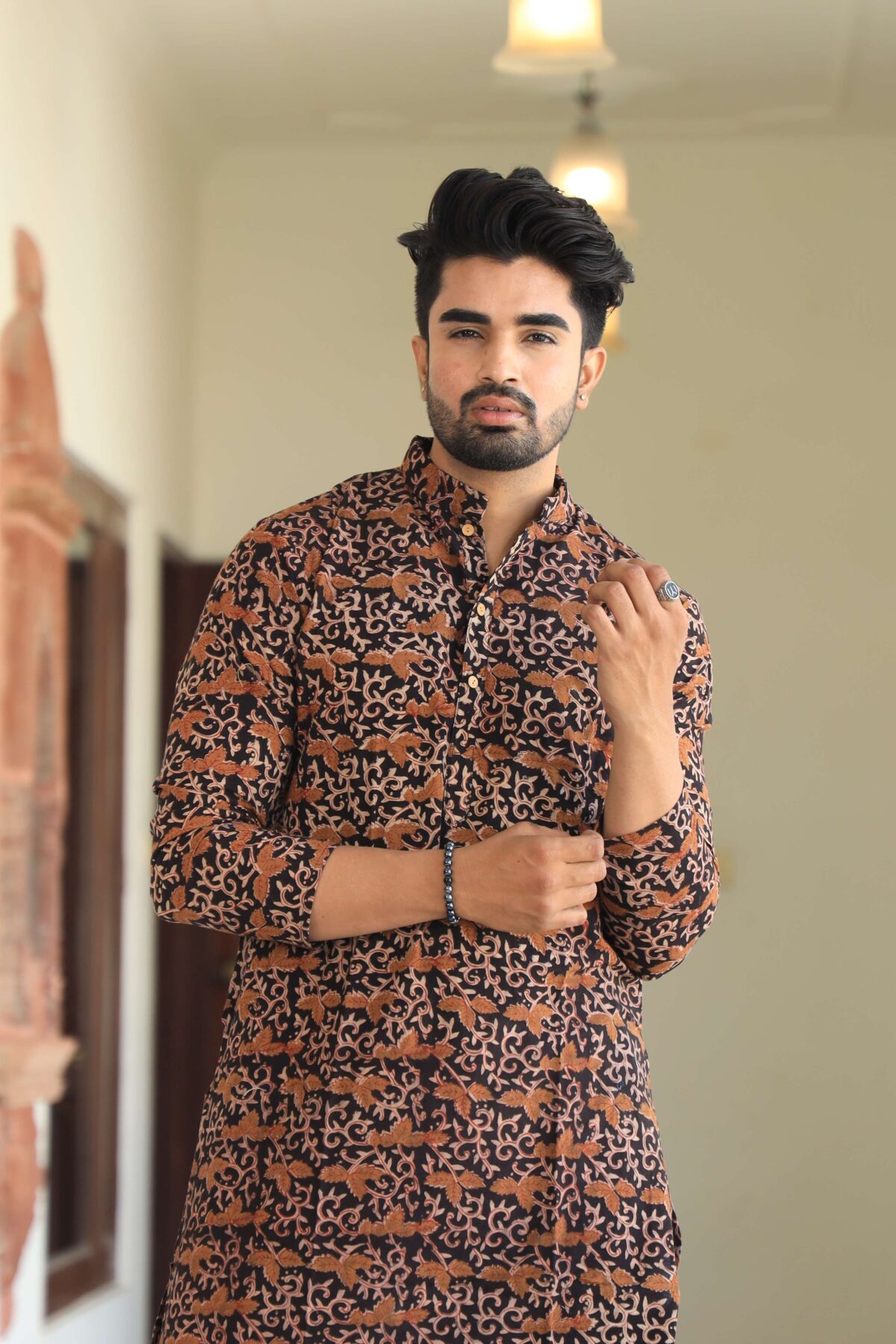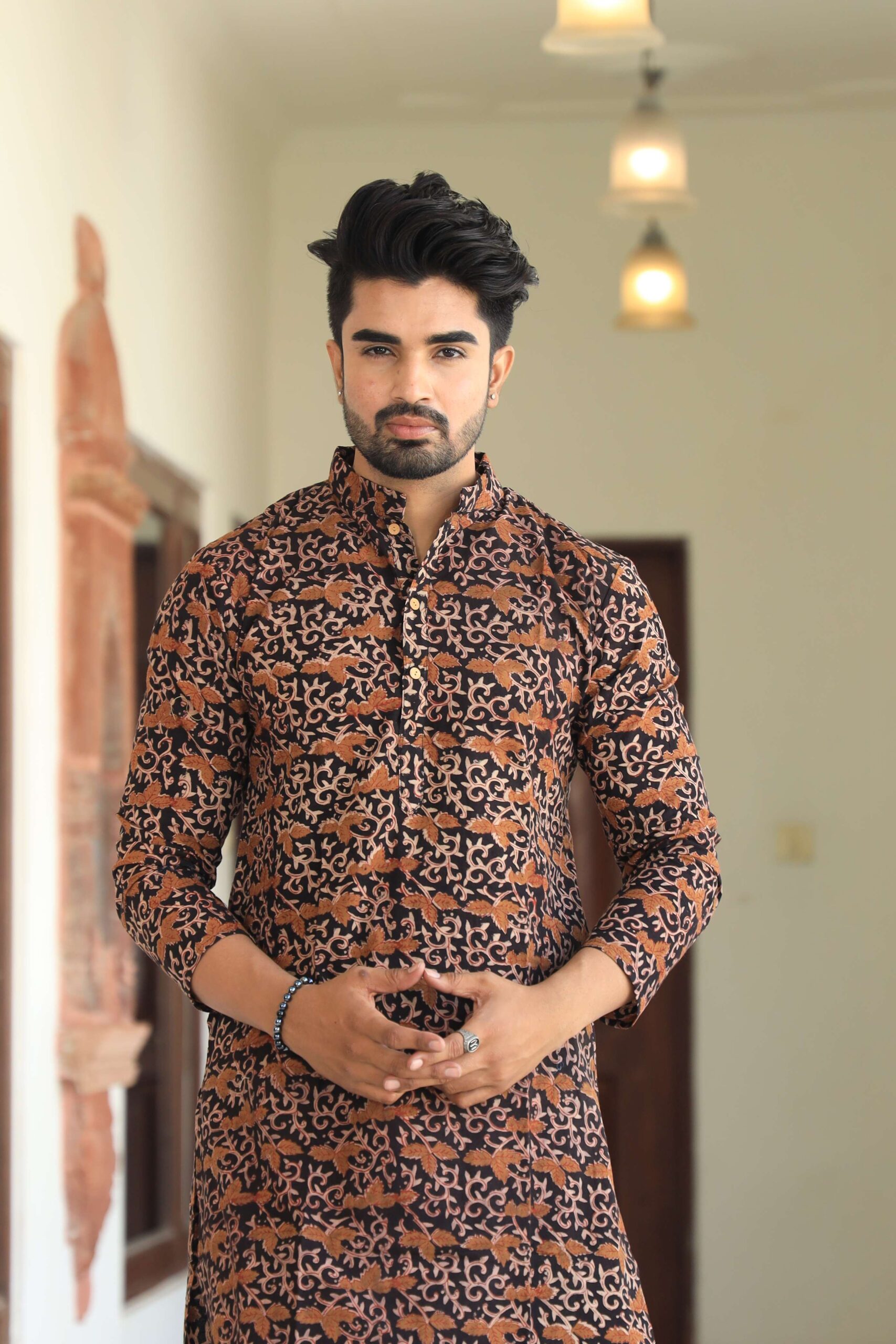 stylish Brown & Black printed cotton kurta set for men, paired Brown & Black with classic white pajama pants. Designed with a comfortable fit and elegant detailing, this kurta is perfect for festivals, weddings, parties, pooja ceremonies, and cultural celebrations. The breathable cotton fabric ensures comfort, while the subtle printed motifs add a touch of sophistication. Pair it with leather sandals or juttis to complete your traditional look.