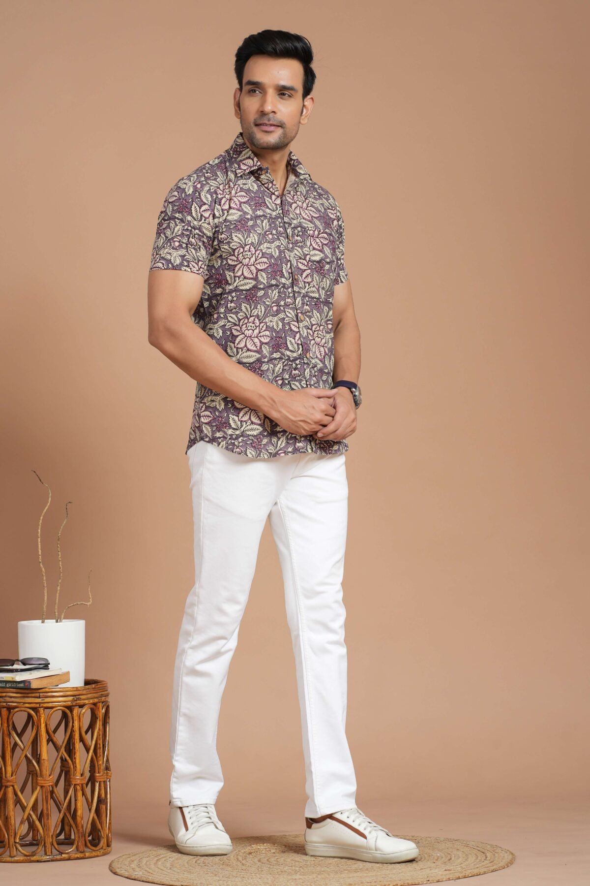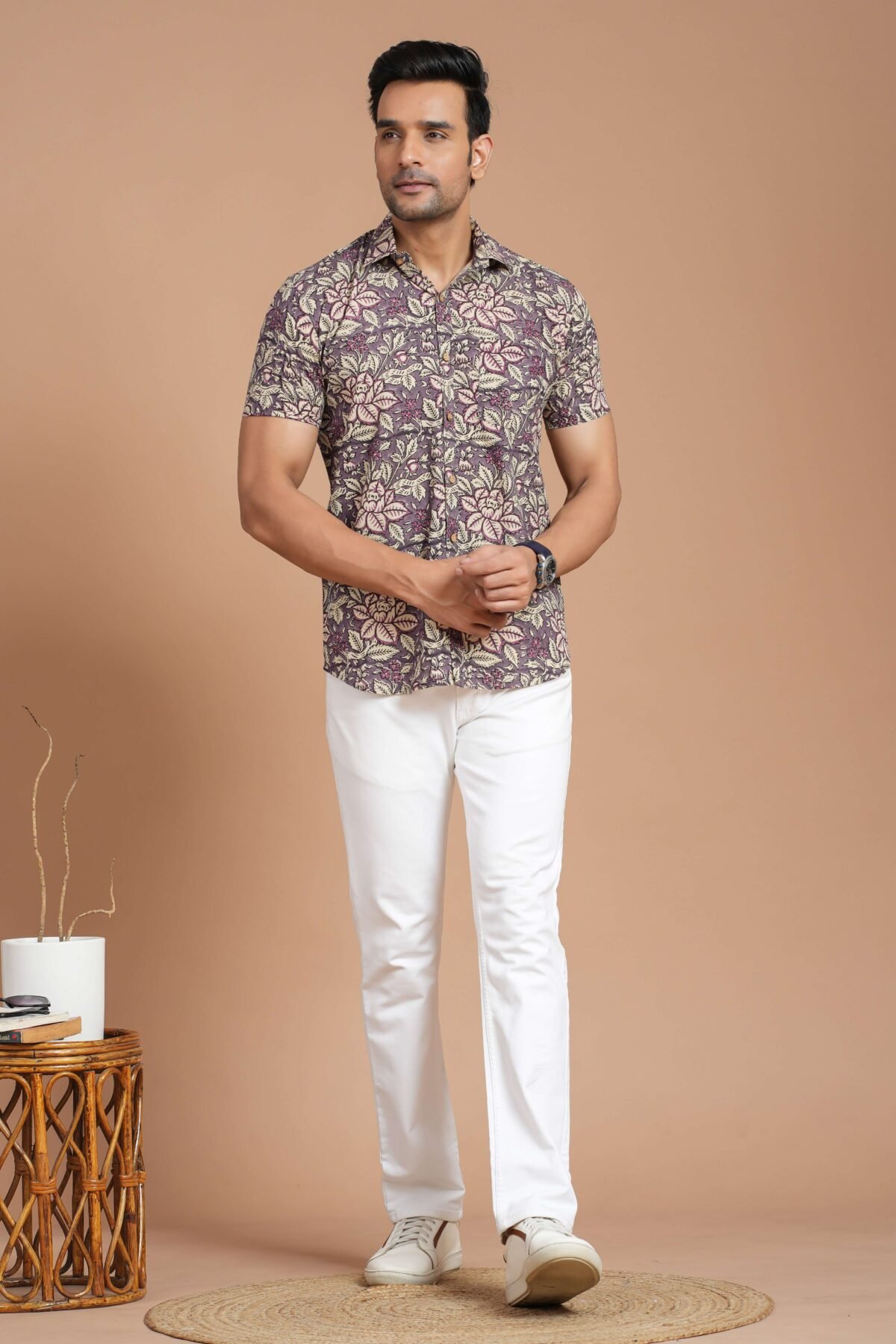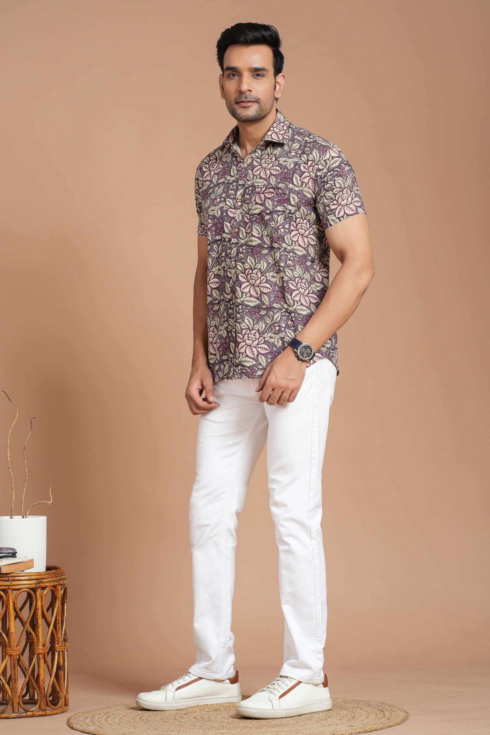 Men’s Cotton Purple Floral Printed Short-Sleeve Shirt ? Casual & Summer Wear