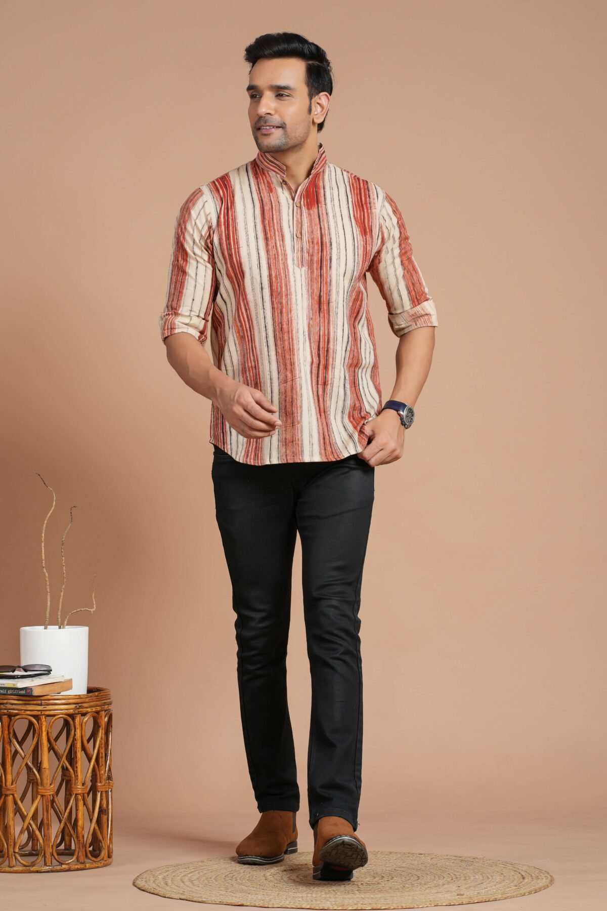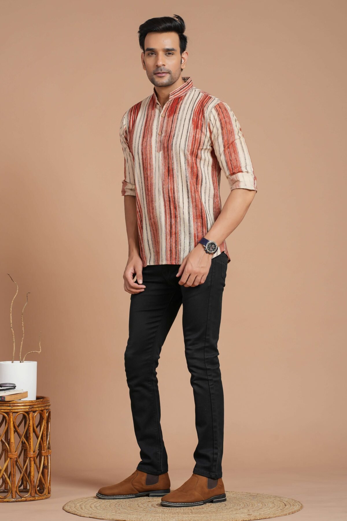 Men’s Cotton Red & Beige Striped Casual Kurta ? Daily & Festive Wear
