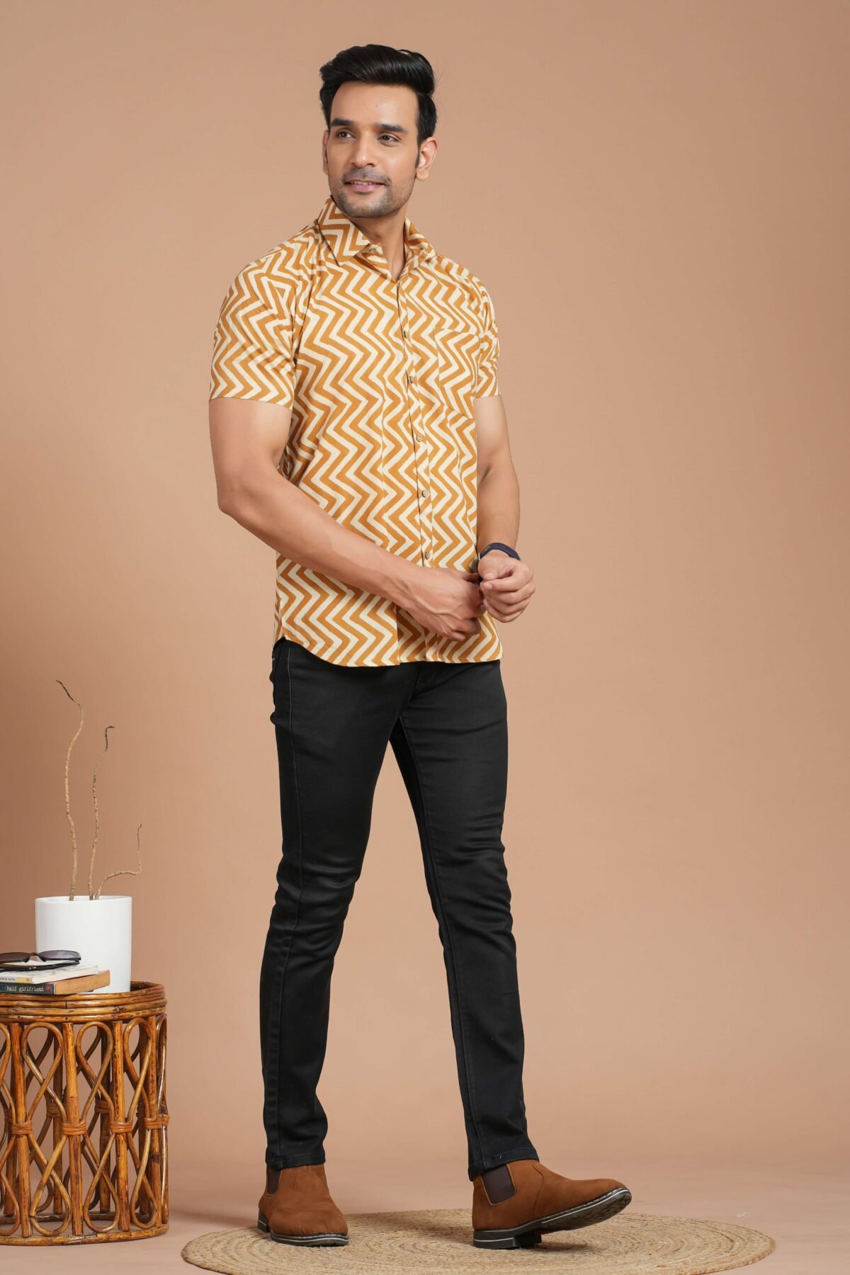 Men’s Cotton Yellow Zigzag Printed Short-Sleeve Shirt ? Casual Summer Wear