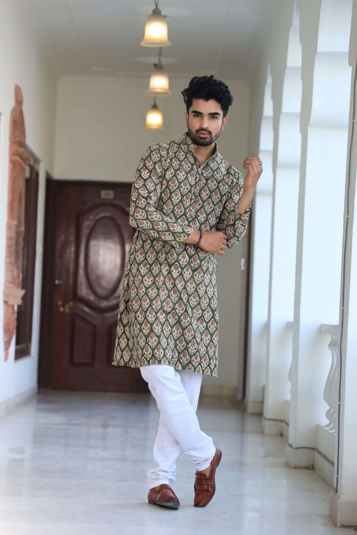 Mens Green Printed Cotton Kurta with White Pajama ? Traditional Festive & Casual Wear