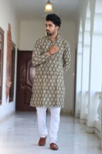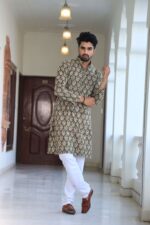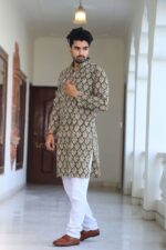 stylish Green printed cotton kurta set for men, paired Green with classic white pajama pants. Designed with a comfortable fit and elegant detailing, this kurta is perfect for festivals, weddings, parties, pooja ceremonies, and cultural celebrations. The breathable cotton fabric ensures comfort, while the subtle printed motifs add a touch of sophistication. Pair it with leather sandals or juttis to complete your traditional look.