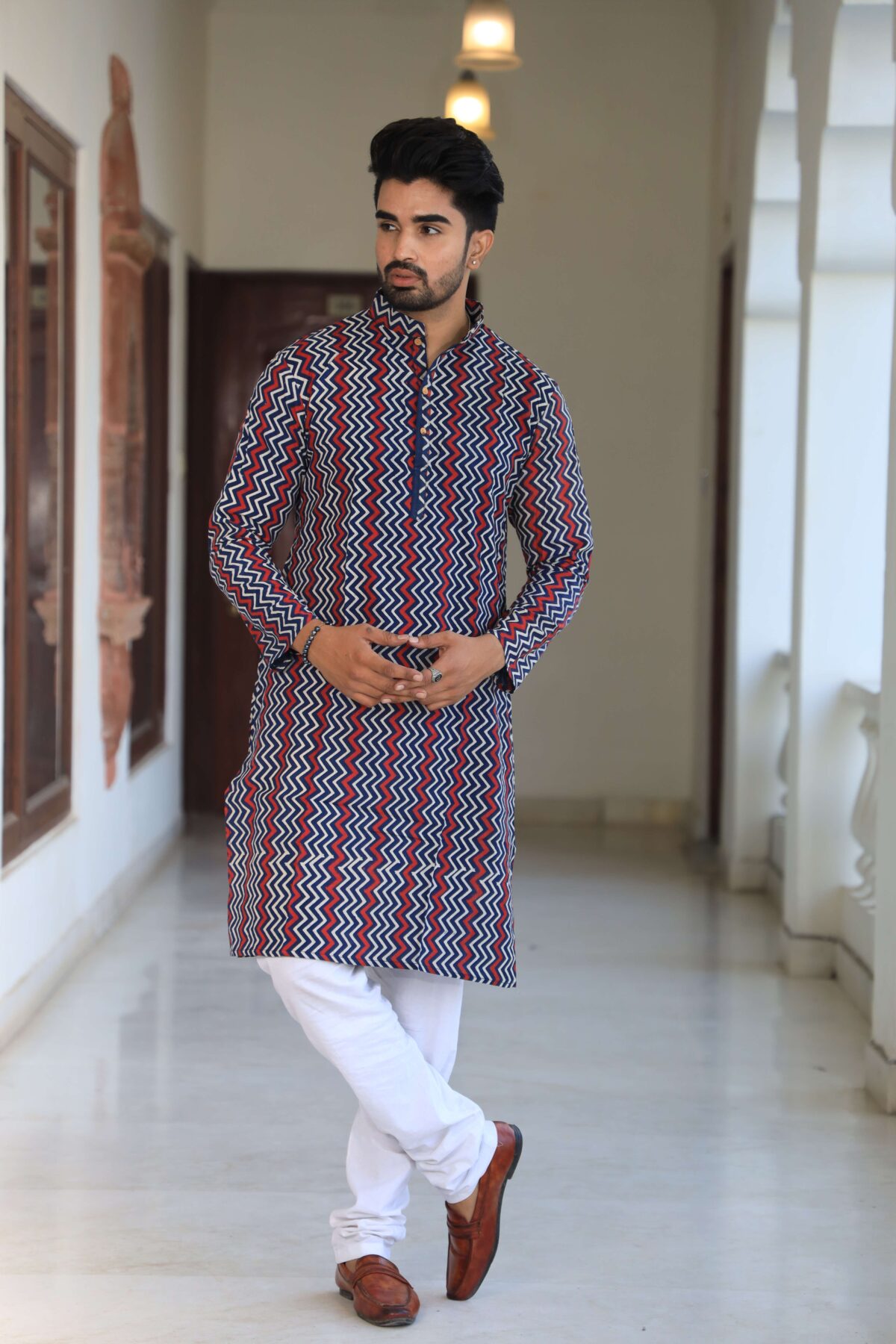 stylish Multicolor Zig-Zag printed cotton kurta set for men, paired Multicolor Zig-Zag with classic white pajama pants. Designed with a comfortable fit and elegant detailing, this kurta is perfect for festivals, weddings, parties, pooja ceremonies, and cultural celebrations. The breathable cotton fabric ensures comfort, while the subtle printed motifs add a touch of sophistication. Pair it with leather sandals or juttis to complete your traditional look.