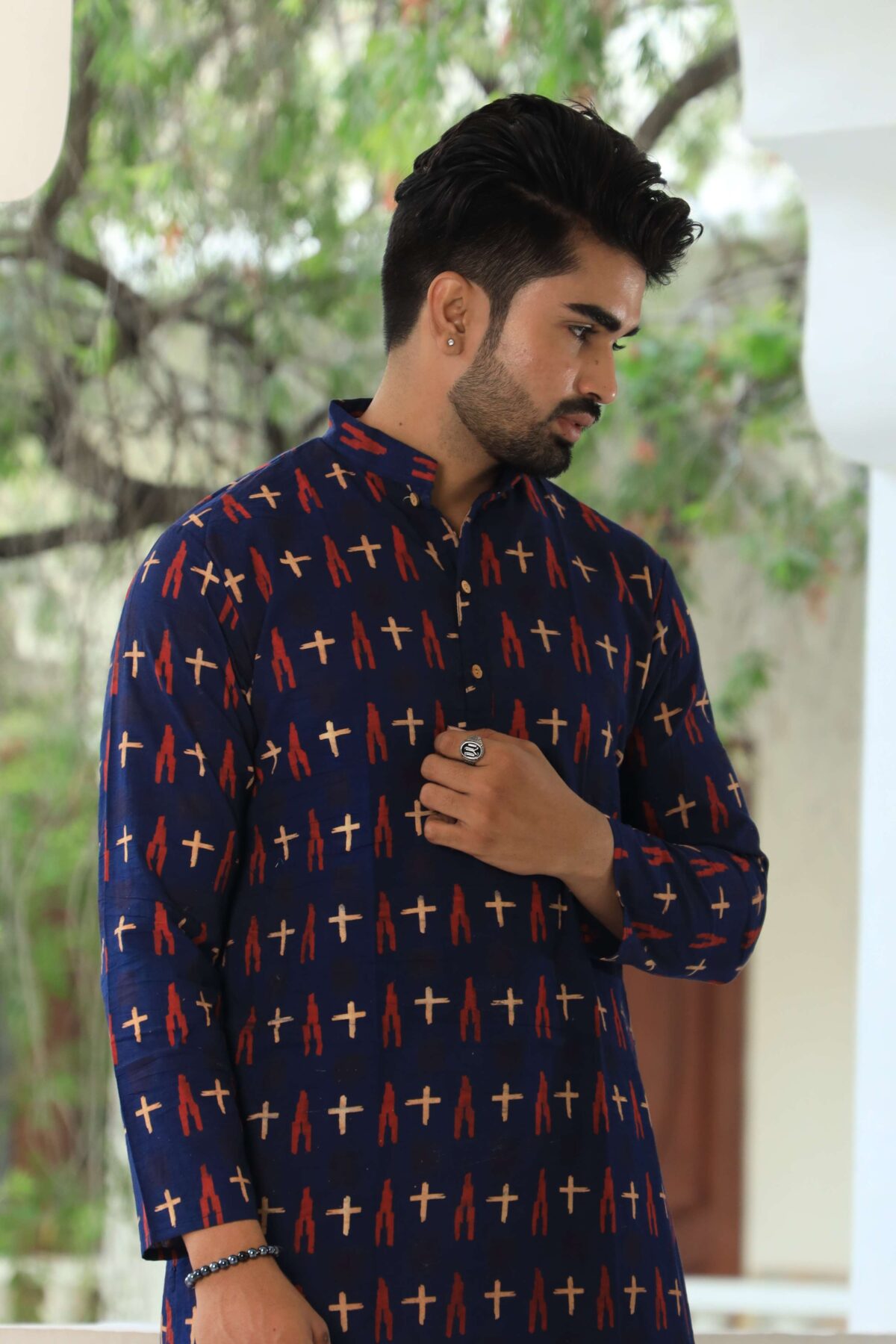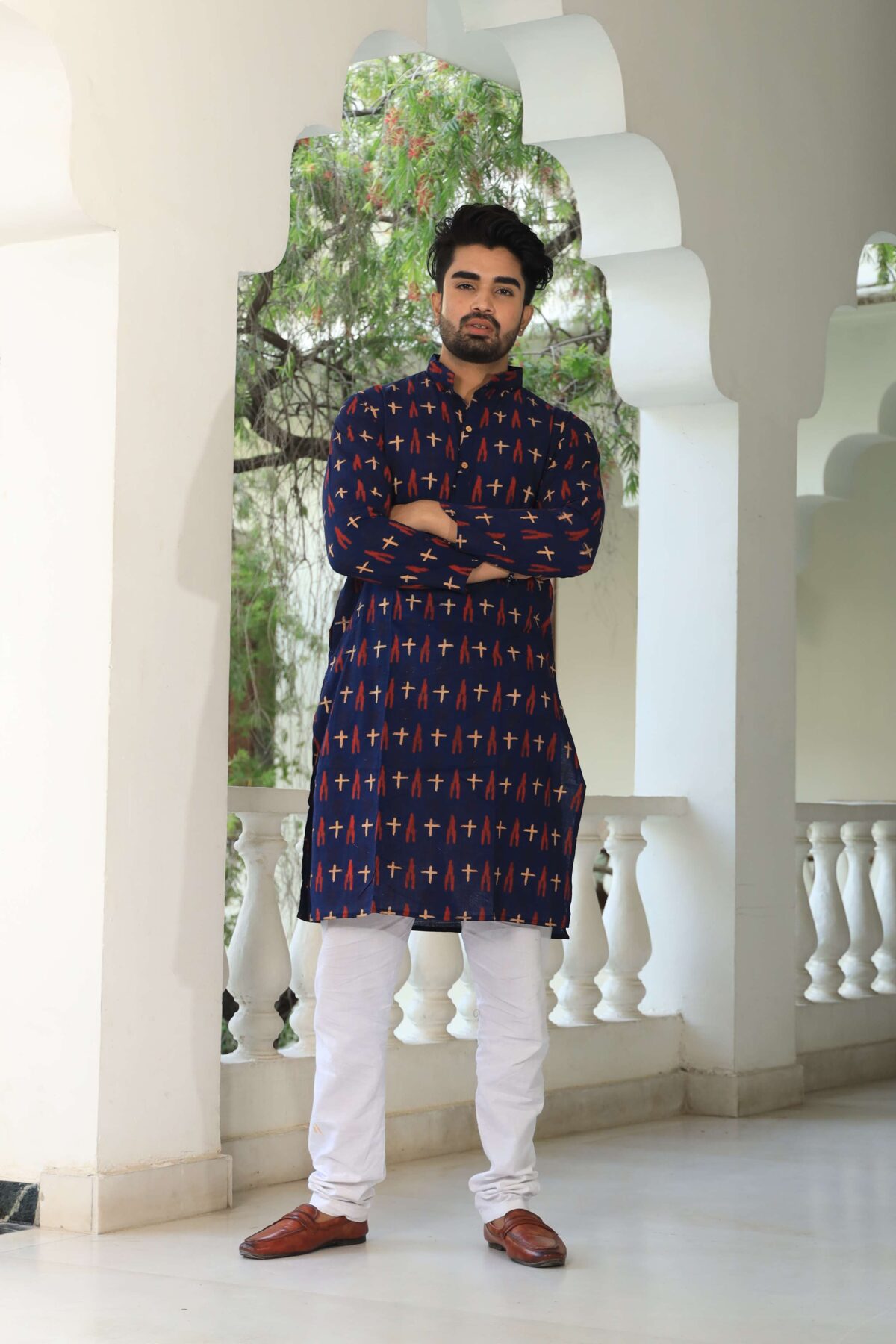 stylish navy blue printed cotton kurta set for men, paired with classic white pajama pants. Designed with a comfortable fit and elegant detailing, this kurta is perfect for festivals, weddings, parties, pooja ceremonies, and cultural celebrations. The breathable cotton fabric ensures comfort, while the subtle printed motifs add a touch of sophistication. Pair it with leather sandals or juttis to complete your traditional look.