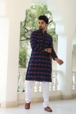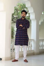 Mens Navy Blue Printed Cotton Kurta with White Pajama ? Stylish Ethnic Wear for Weddings & Festive Celebrations