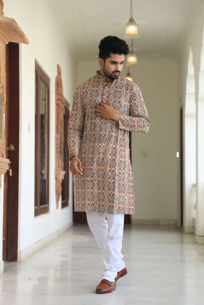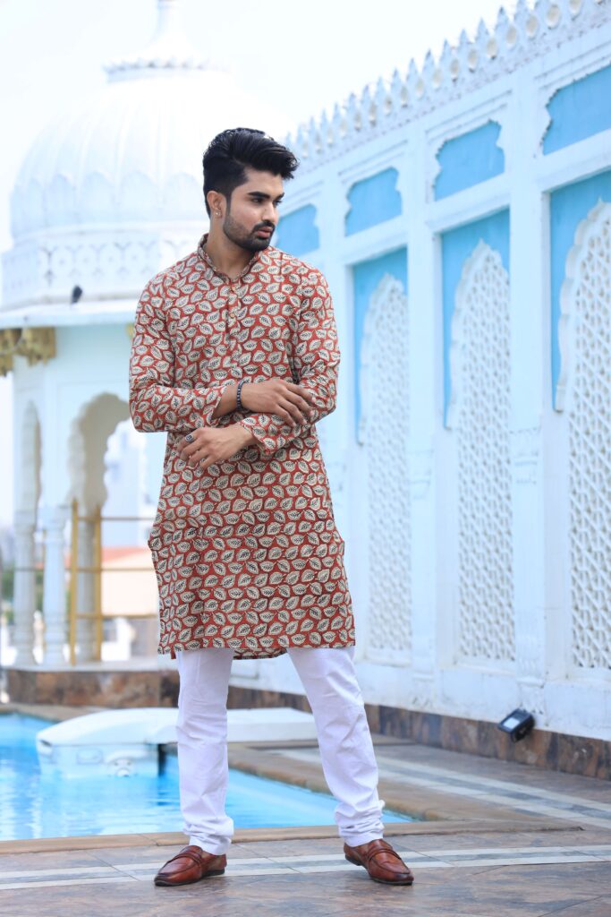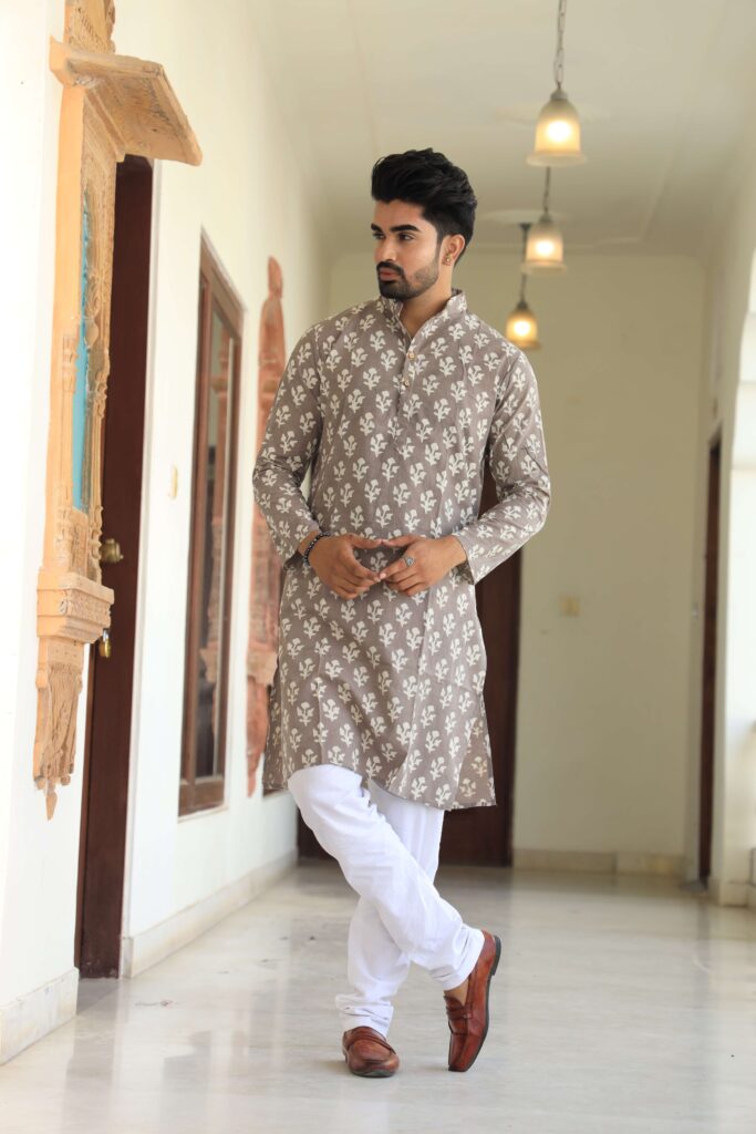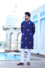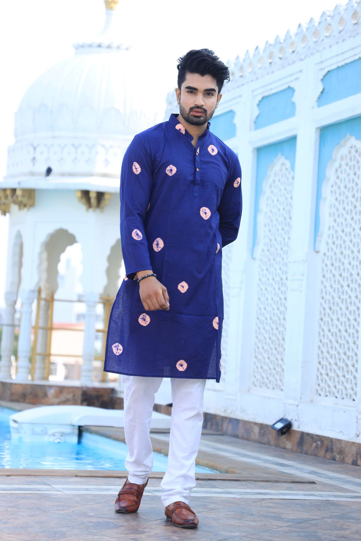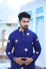stylish navy blue printed cotton kurta set for men, paired with classic white pajama pants. Designed with a comfortable fit and elegant detailing, this kurta is perfect for festivals, weddings, parties, pooja ceremonies, and cultural celebrations. The breathable cotton fabric ensures comfort, while the subtle printed motifs add a touch of sophistication. Pair it with leather sandals or juttis to complete your traditional look.