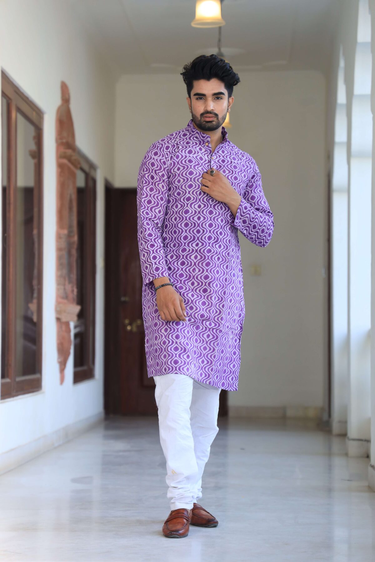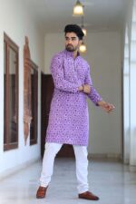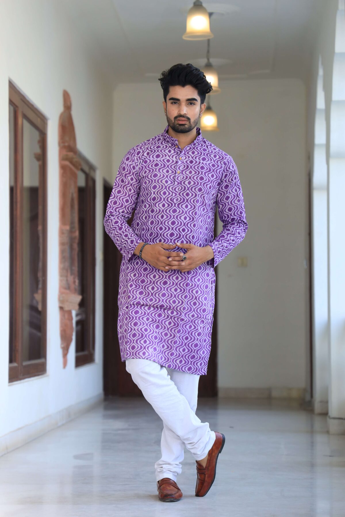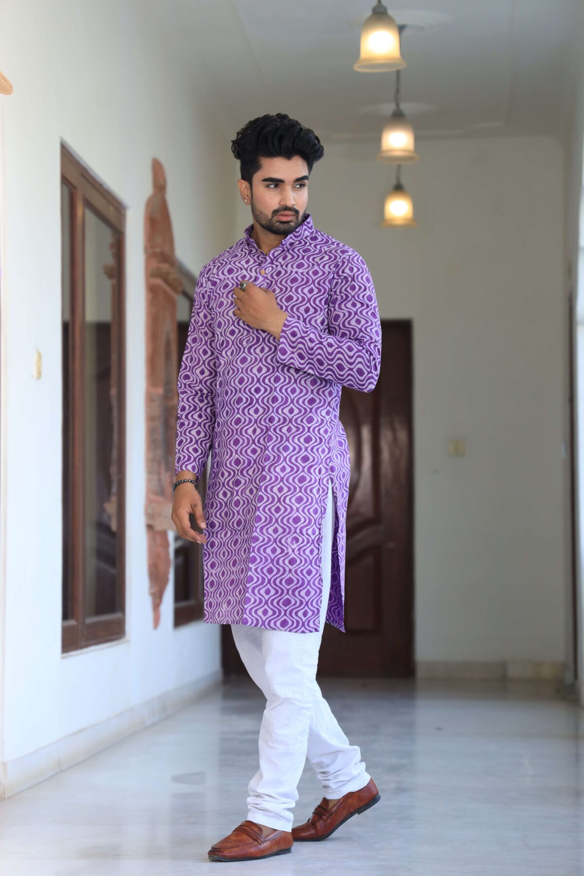 stylish Purple printed cotton kurta set for men, paired purple with classic white pajama pants. Designed with a comfortable fit and elegant detailing, this kurta is perfect for festivals, weddings, parties, pooja ceremonies, and cultural celebrations. The breathable cotton fabric ensures comfort, while the subtle printed motifs add a touch of sophistication. Pair it with leather sandals or juttis to complete your traditional look.