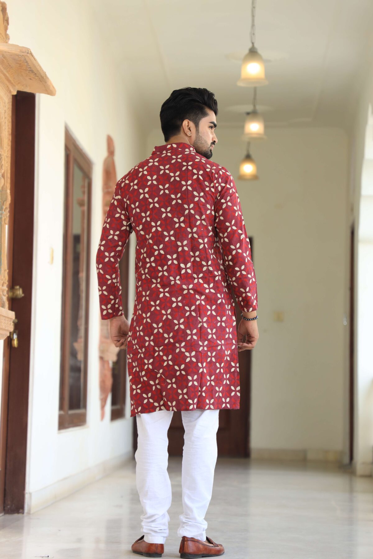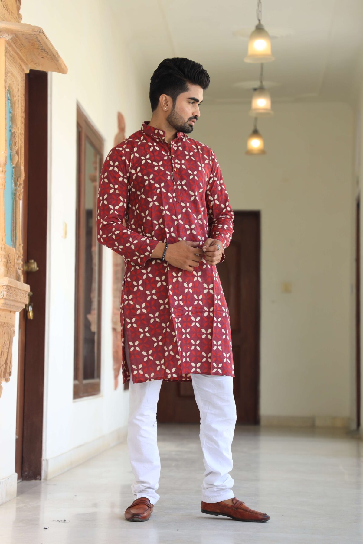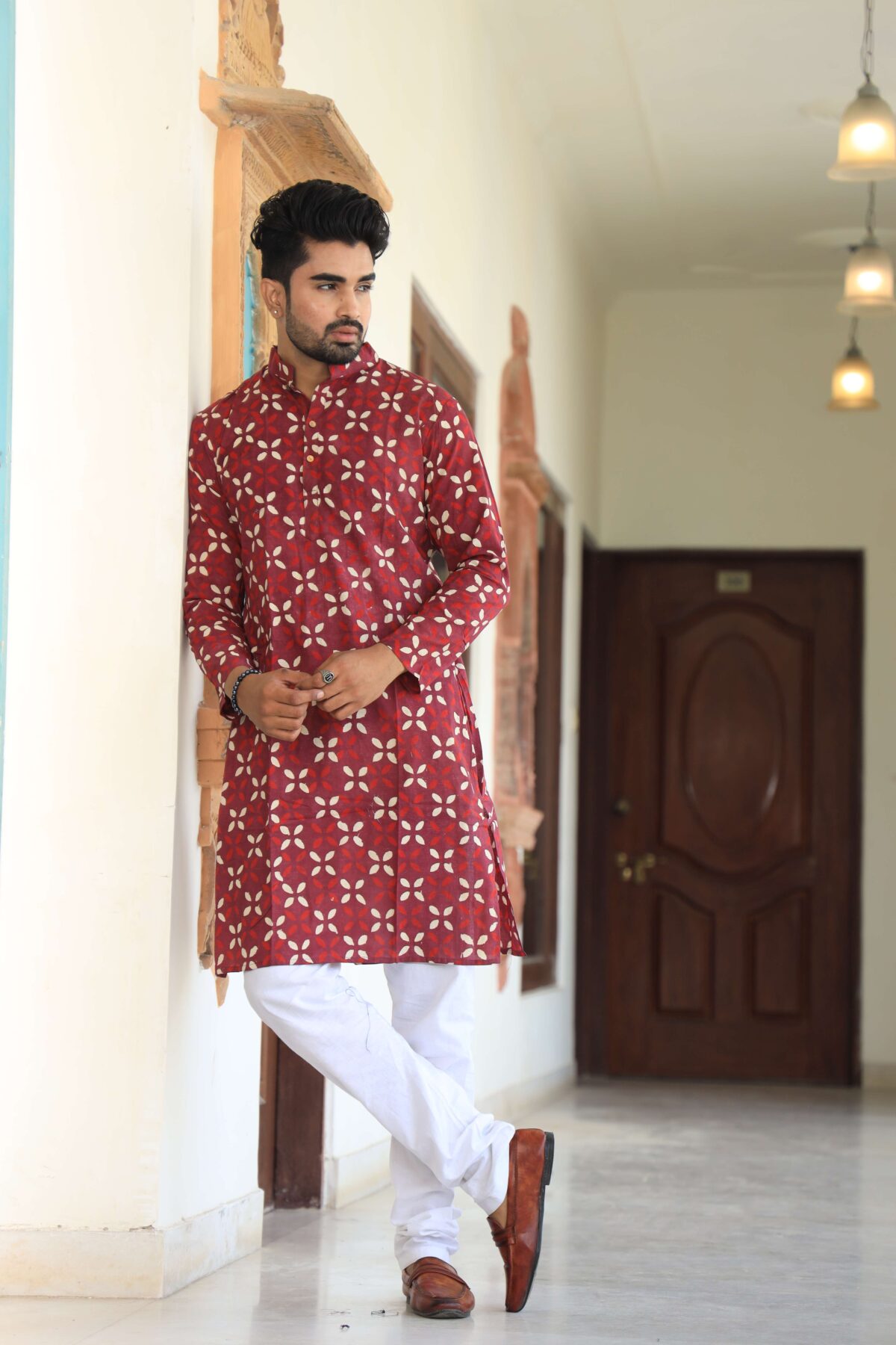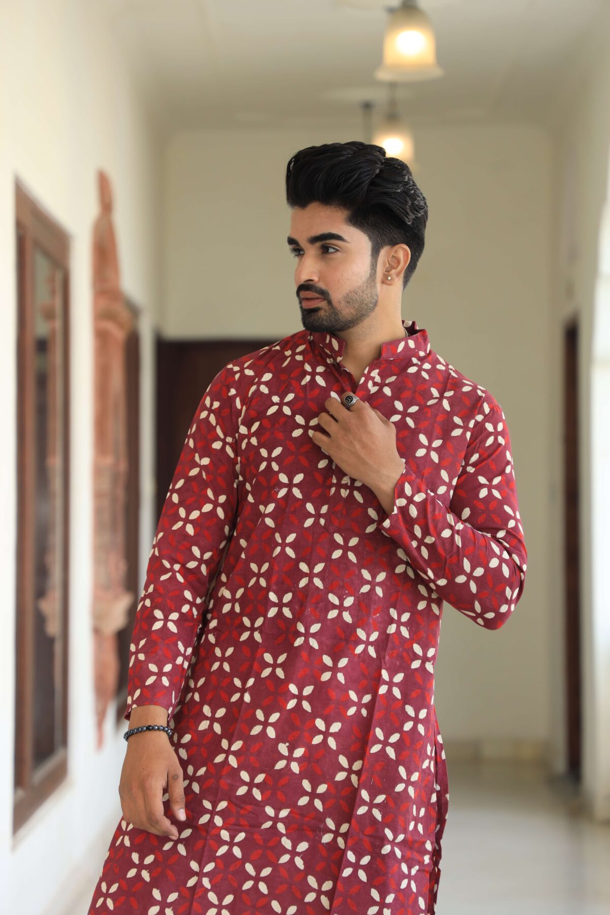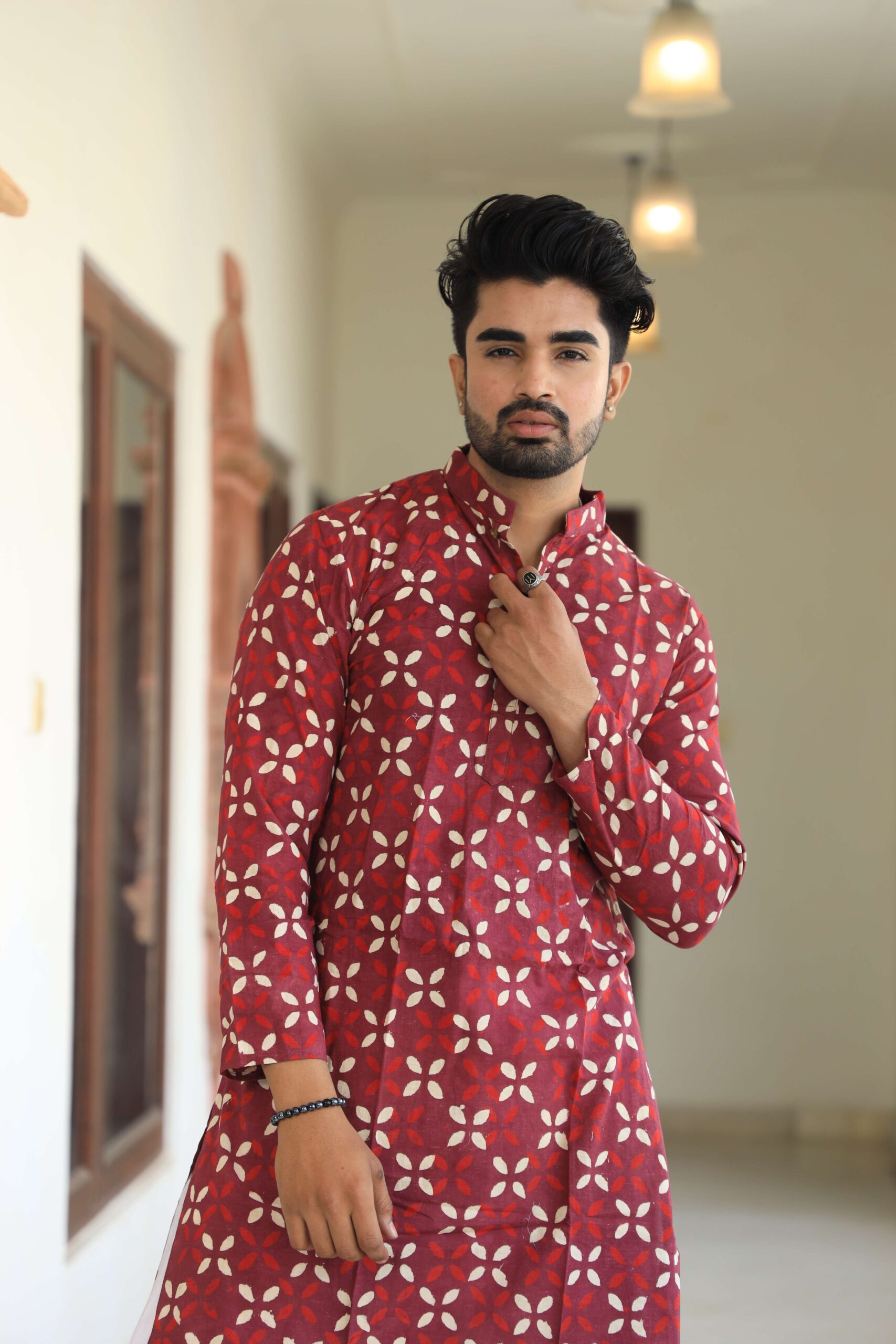 stylish Red Floral printed cotton kurta set for men, paired Red Floral with classic white pajama pants. Designed with a comfortable fit and elegant detailing, this kurta is perfect for festivals, weddings, parties, pooja ceremonies, and cultural celebrations. The breathable cotton fabric ensures comfort, while the subtle printed motifs add a touch of sophistication. Pair it with leather sandals or juttis to complete your traditional look.