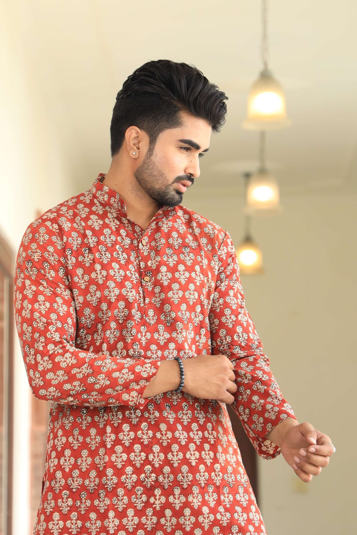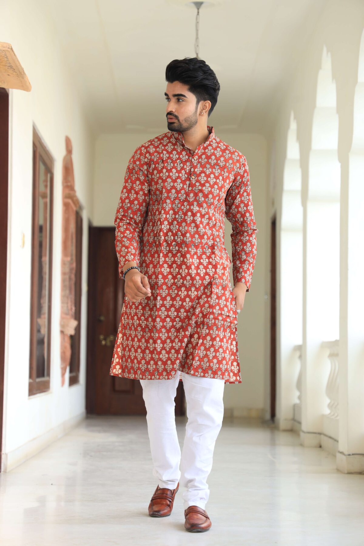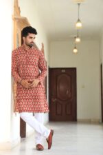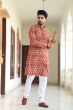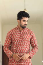 stylish Red printed cotton kurta set for men, paired Red with classic white pajama pants. Designed with a comfortable fit and elegant detailing, this kurta is perfect for festivals, weddings, parties, pooja ceremonies, and cultural celebrations. The breathable cotton fabric ensures comfort, while the subtle printed motifs add a touch of sophistication. Pair it with leather sandals or juttis to complete your traditional look.