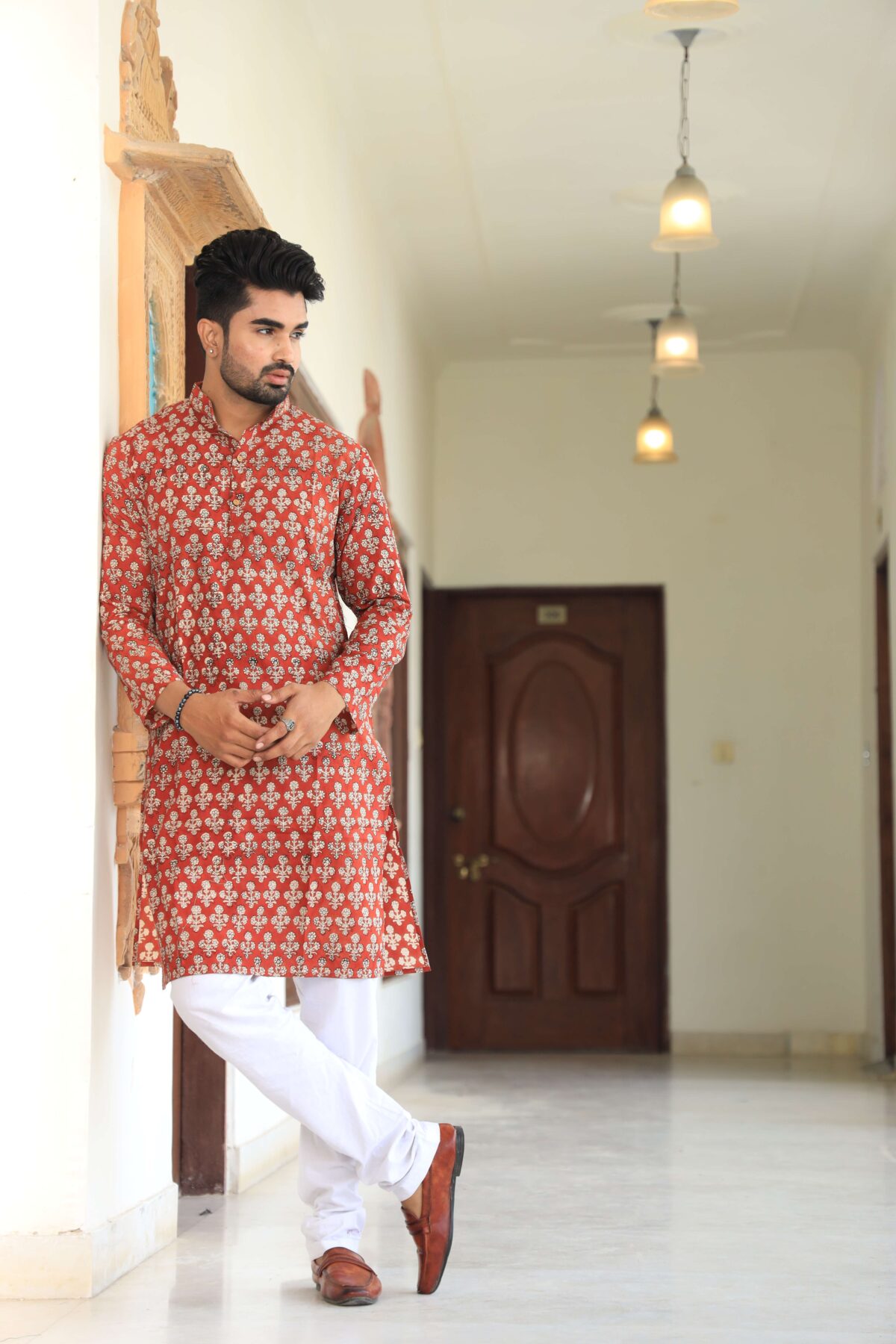 Mens Red Printed Cotton Kurta with White Pajama ? Traditional Ethnic Wear for Festive & Wedding