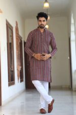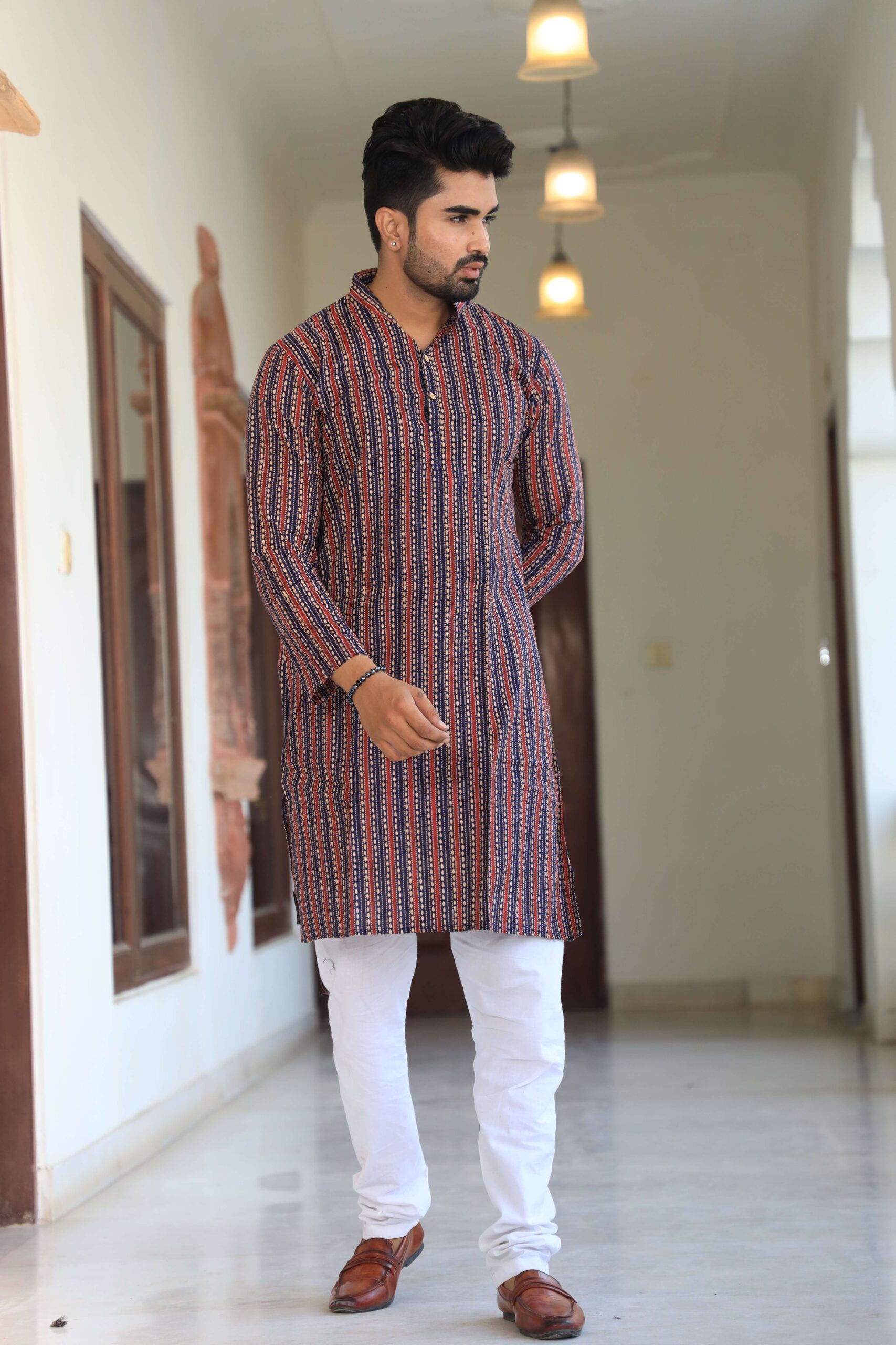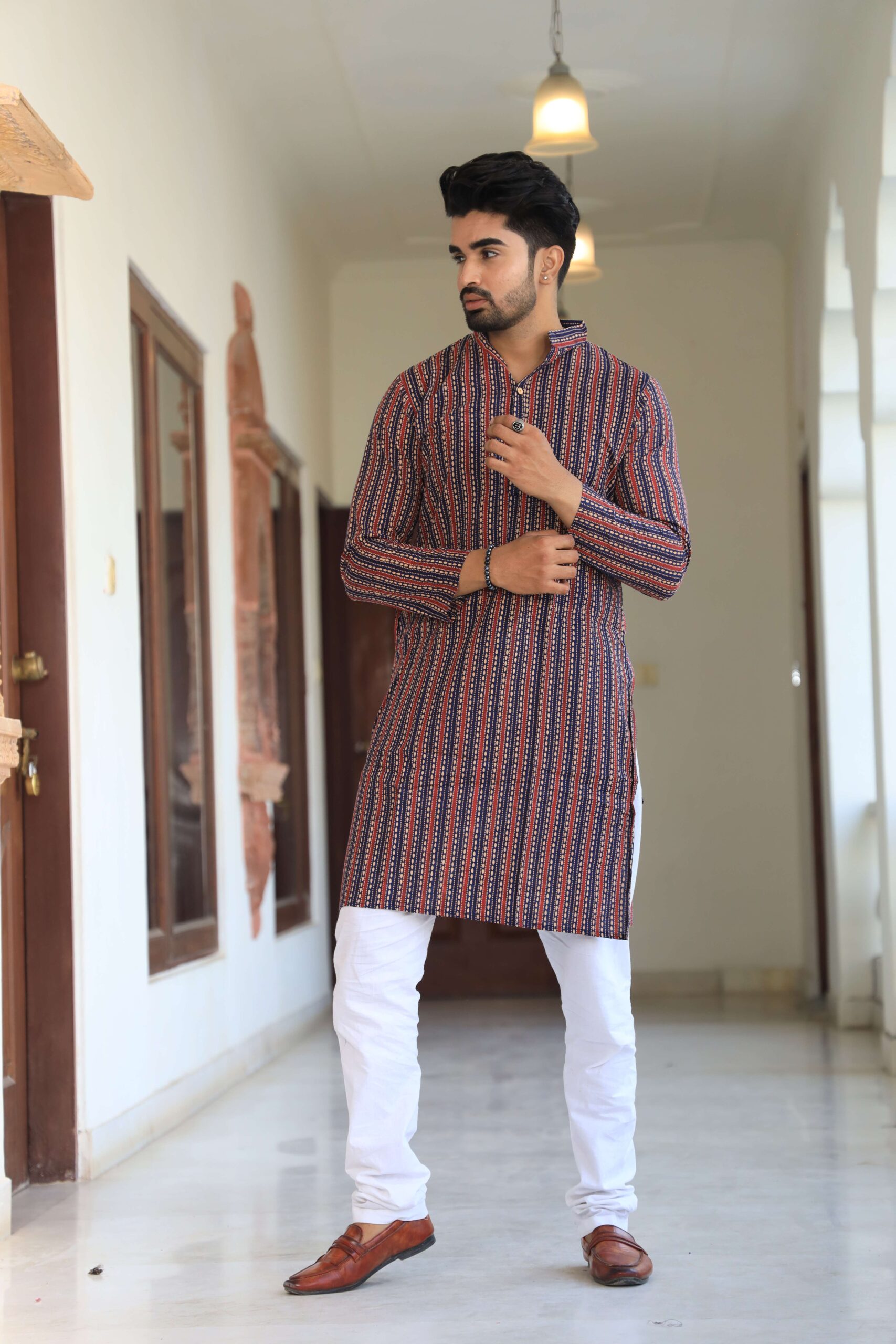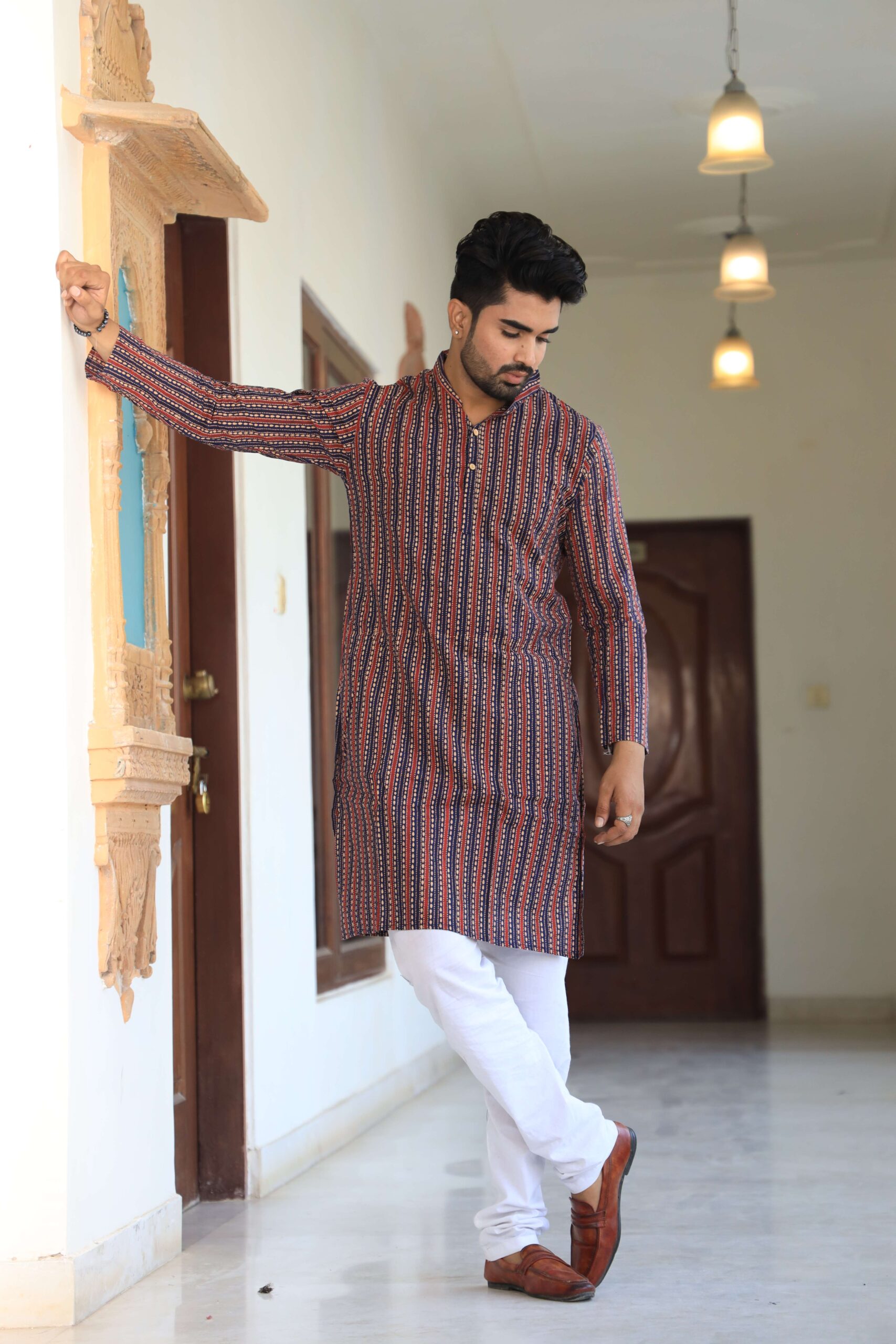 stylish Striped printed cotton kurta set for men, paired red and blue with classic white pajama pants. Designed with a comfortable fit and elegant detailing, this kurta is perfect for festivals, weddings, parties, pooja ceremonies, and cultural celebrations. The breathable cotton fabric ensures comfort, while the subtle printed motifs add a touch of sophistication. Pair it with leather sandals or juttis to complete your traditional look.