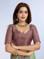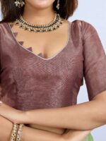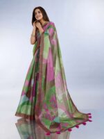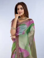 Make a bold artistic statement with this Modern Abstract Printed Linen Shimmer Saree. Crafted from a lightweight and luxurious linen shimmer fabric, this saree offers a graceful drape and a subtle glow. The design features a captivating abstract print with large color blocks in a rich palette of plum, various shades of green, and soft aqua blue. This modern and unique pattern sets it apart, making it a true showstopper.