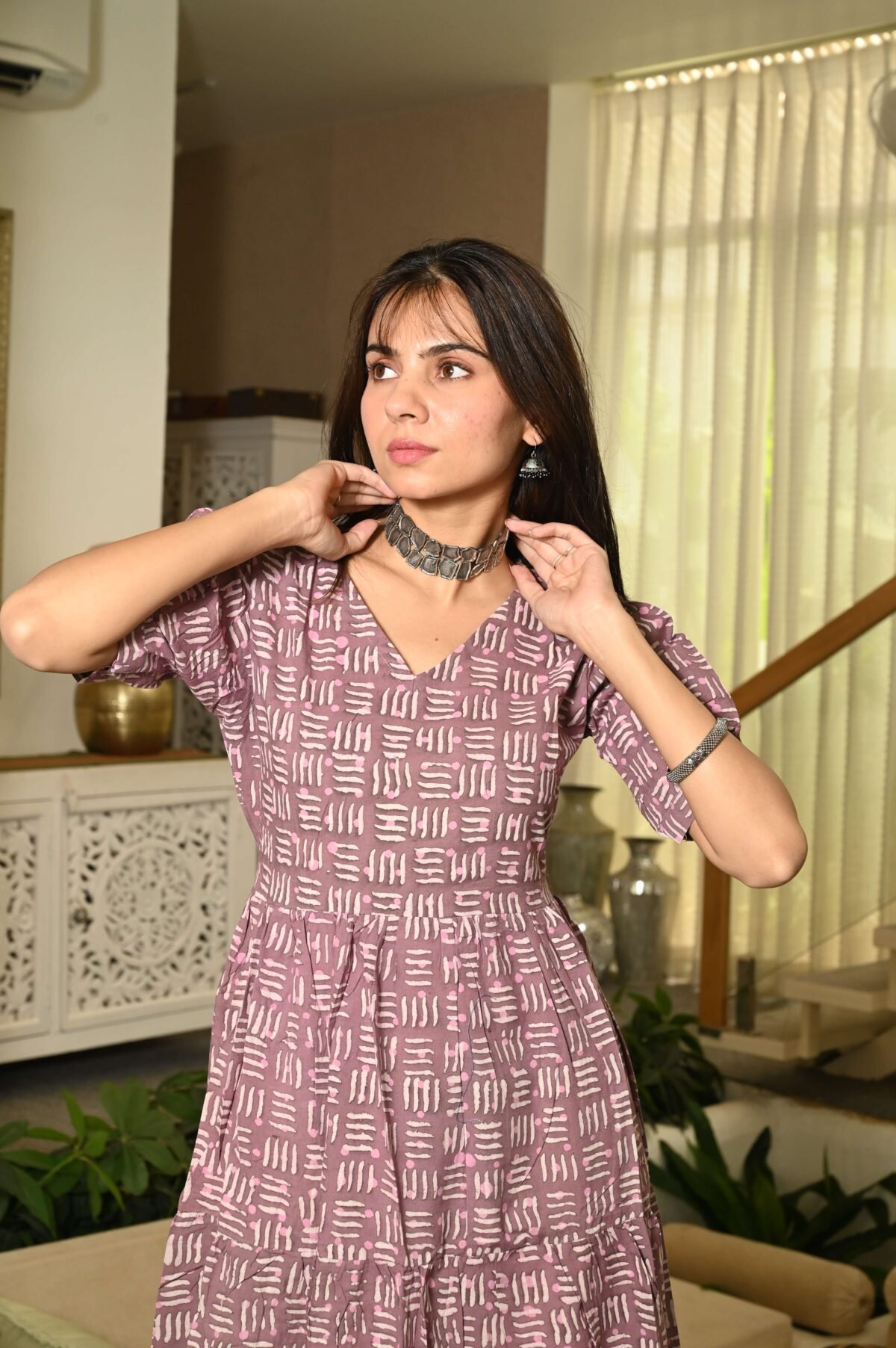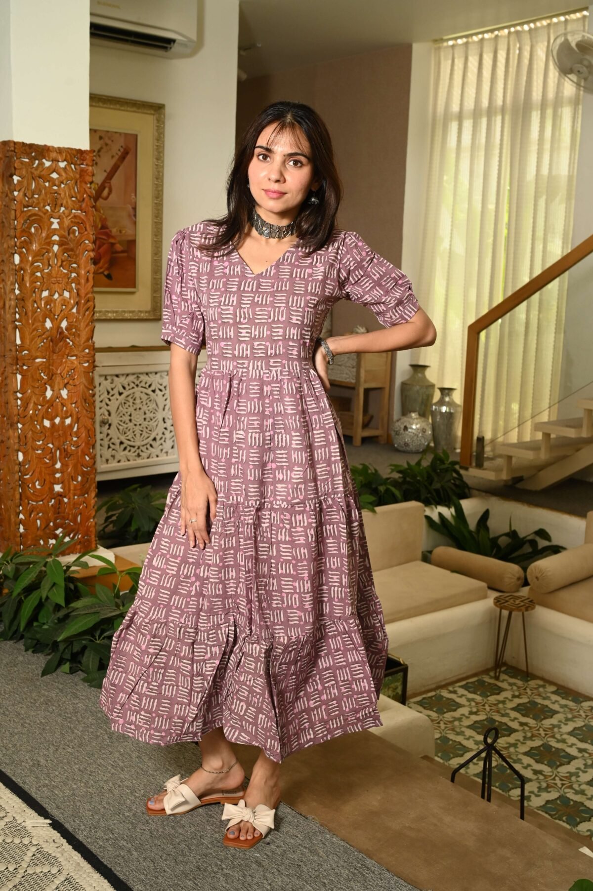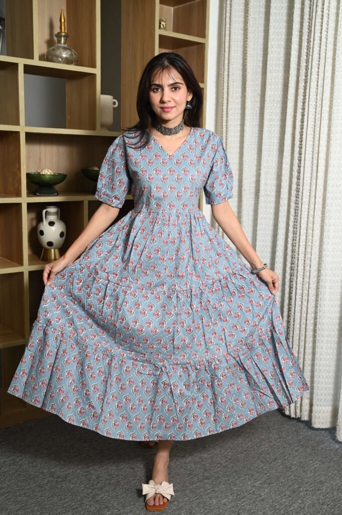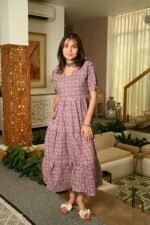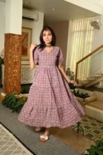 Elevate your everyday look with this Mouve Printed Cotton Anarkali Maxi Dress, designed to blend comfort with chic style. Crafted from breathable cotton fabric, this dress features a beautiful all-over floral pattern that adds a touch of charm and femininity. The V-neckline and puff sleeves give it a trendy silhouette, while the flared tiered hemline ensures graceful movement with every step.