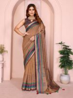 Add a vibrant touch to your wardrobe with this Mustard Brown Geometric Black Chanderi Saree. Featuring a rich mustard-brown base adorned with delicate multicolor polka dot digital prints, this saree exudes both sophistication and contemporary style.