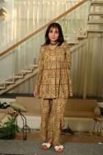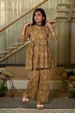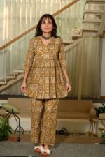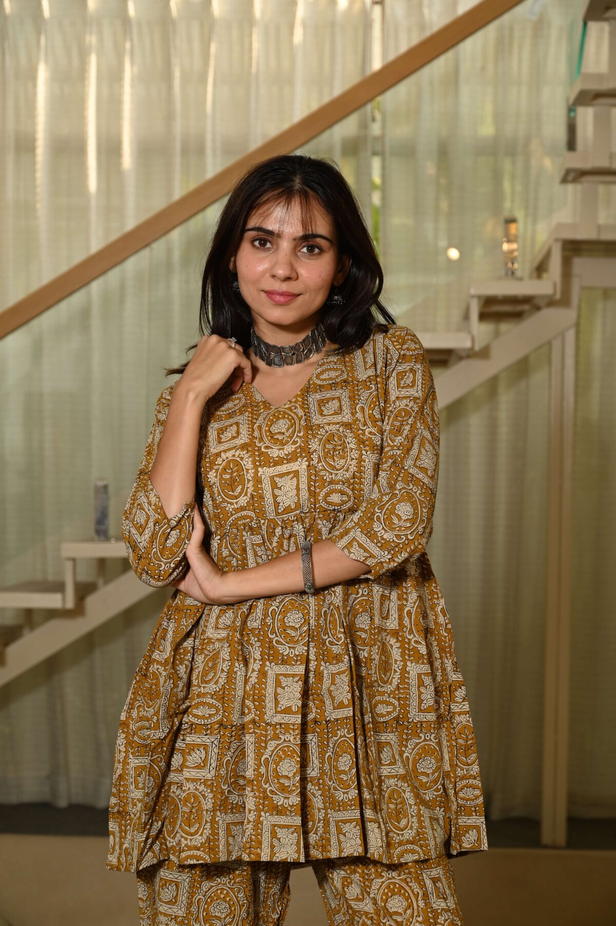 Mustard Yellow Block Print Cotton Co-ord Set for Women ? Peplum Kurta & Straight Pants