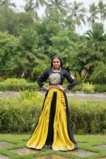 The full-stitched blouse, featuring 14 Kg Reyon with Kutchi Gamthi embroidery and balloon sleeve design, adds a modern and festive touch. Available in a vibrant Yellow-Black combination, this 1.2 KG lightweight set ensures comfort while keeping you fashion-forward during celebrations.