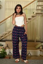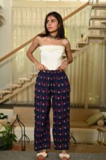 navy blue cotton straight pants for women, detailed with bold red and white abstract motifs for a trendy yet relaxed vibe. Designed with a soft elastic waistband and handy side pockets, these pants ensure day-long comfort while keeping your look effortlessly chic. Ideal for casual outings, lounging, or travel, they pair beautifully with kurtas, tops, or crop blouses.