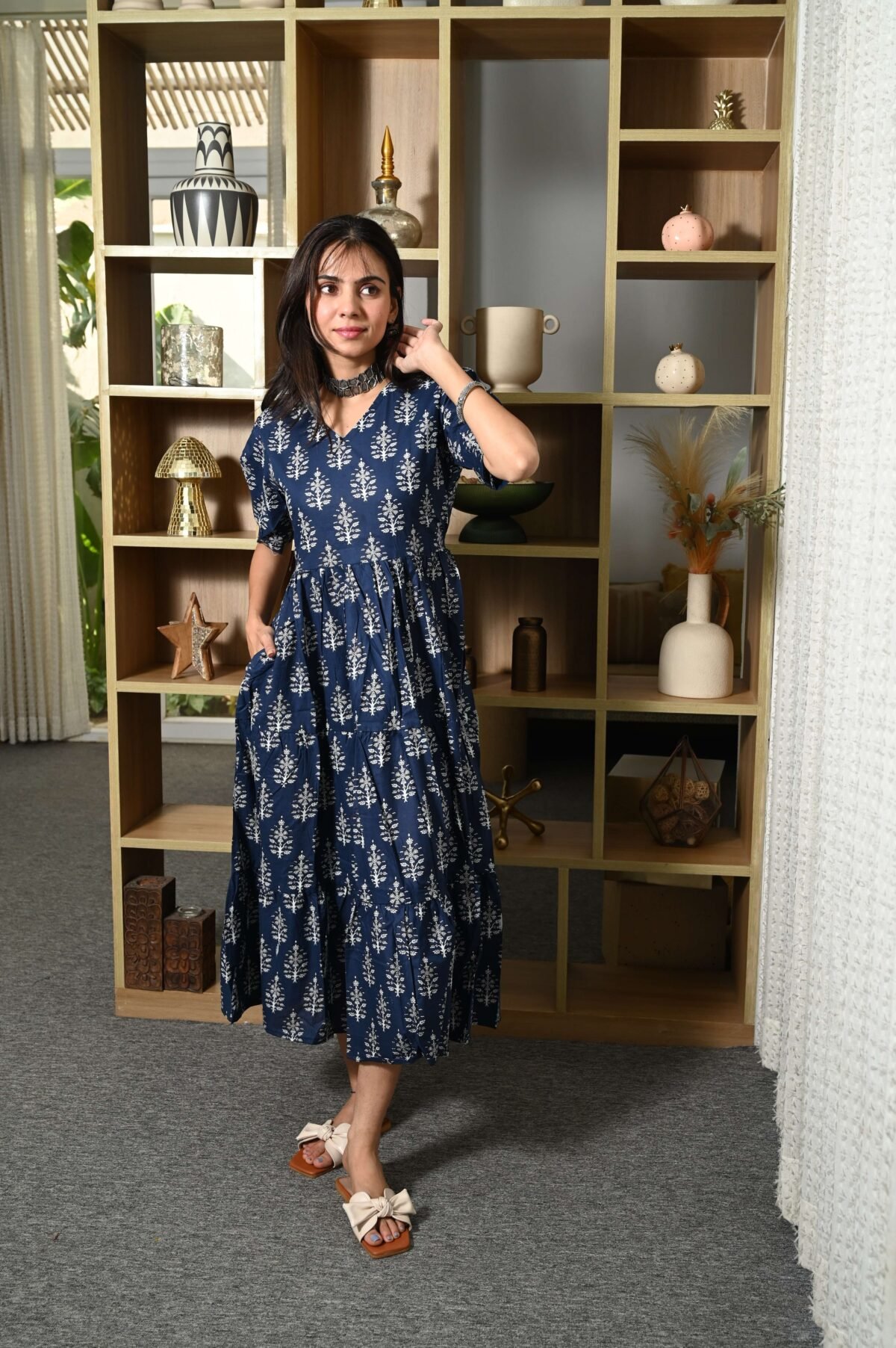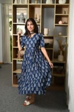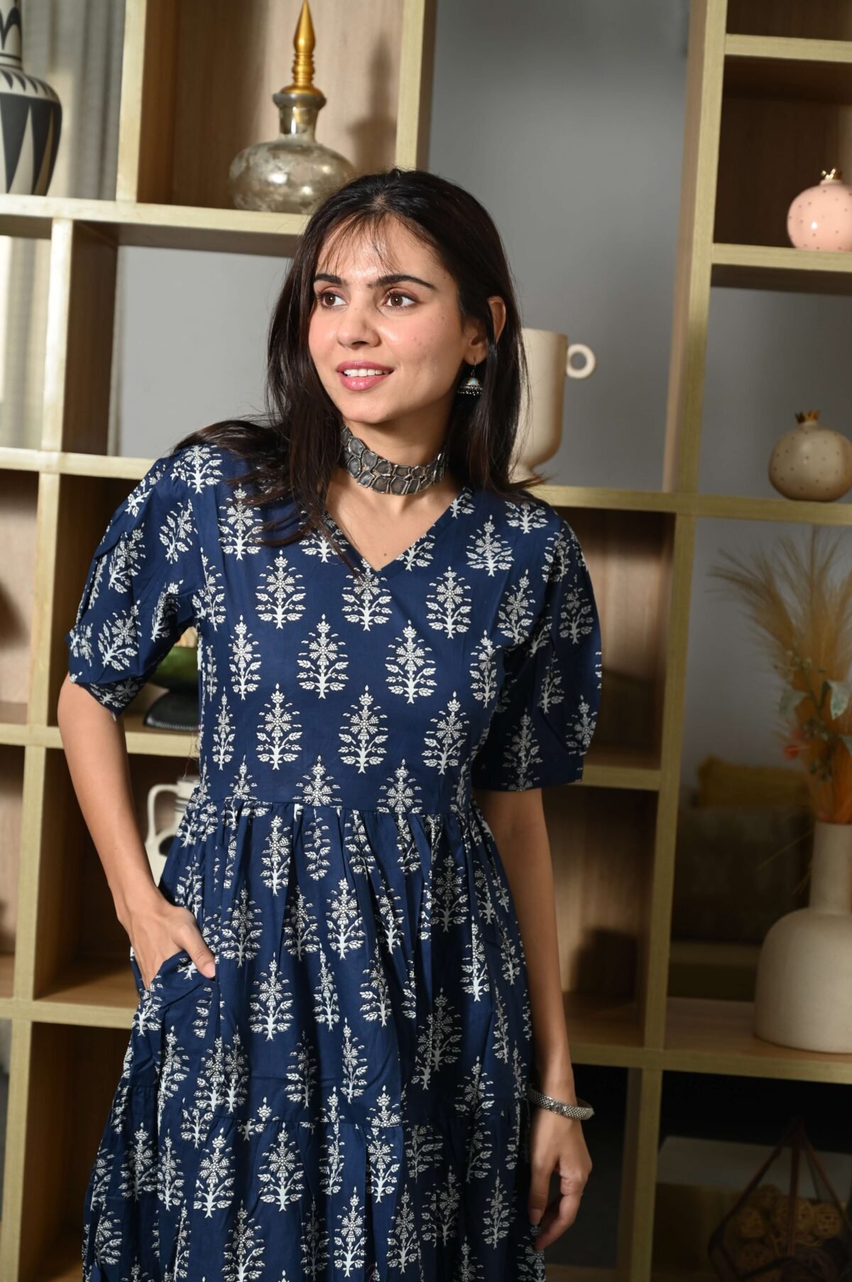 Elevate your everyday look with this Navy-Blue Floral Printed Cotton Anarkali Maxi Dress, designed to blend comfort with chic style. Crafted from breathable cotton fabric, this dress features a beautiful all-over floral pattern that adds a touch of charm and femininity. The V-neckline and puff sleeves give it a trendy silhouette, while the flared tiered hemline ensures graceful movement with every step.