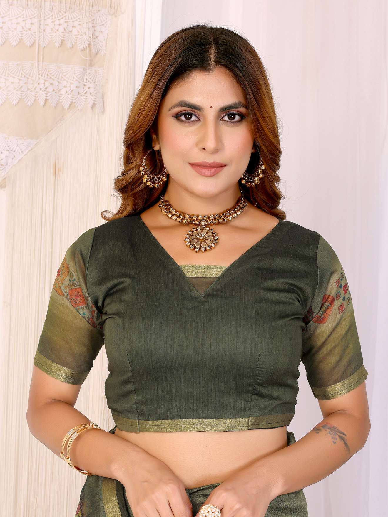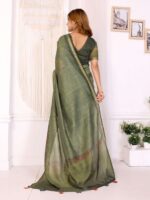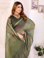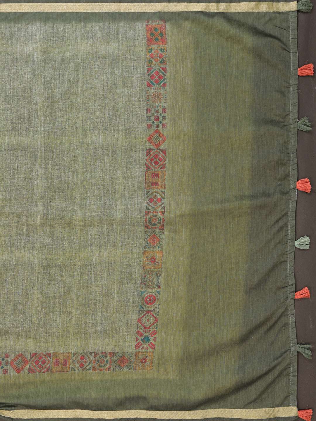 Add a touch of timeless grace to your wardrobe with the Olive Green Chanderi Saree. Crafted in soft Chanderi fabric, this saree features a subtle woven texture that complements its refined appeal. The highlight is its traditional multicolor geometric printed border with tassel detailing, adding depth and vibrancy to the drape.