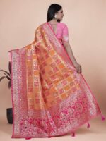 Celebrate timeless tradition with this Orange and Pink Banarasi Silk Saree with Silver Zari Work, a masterpiece that radiates festive grandeur. The bright orange silk base is embellished with silver zari checks and floral weaving, blending heritage artistry with vibrant charm.