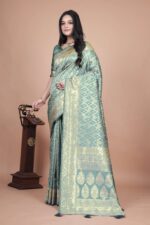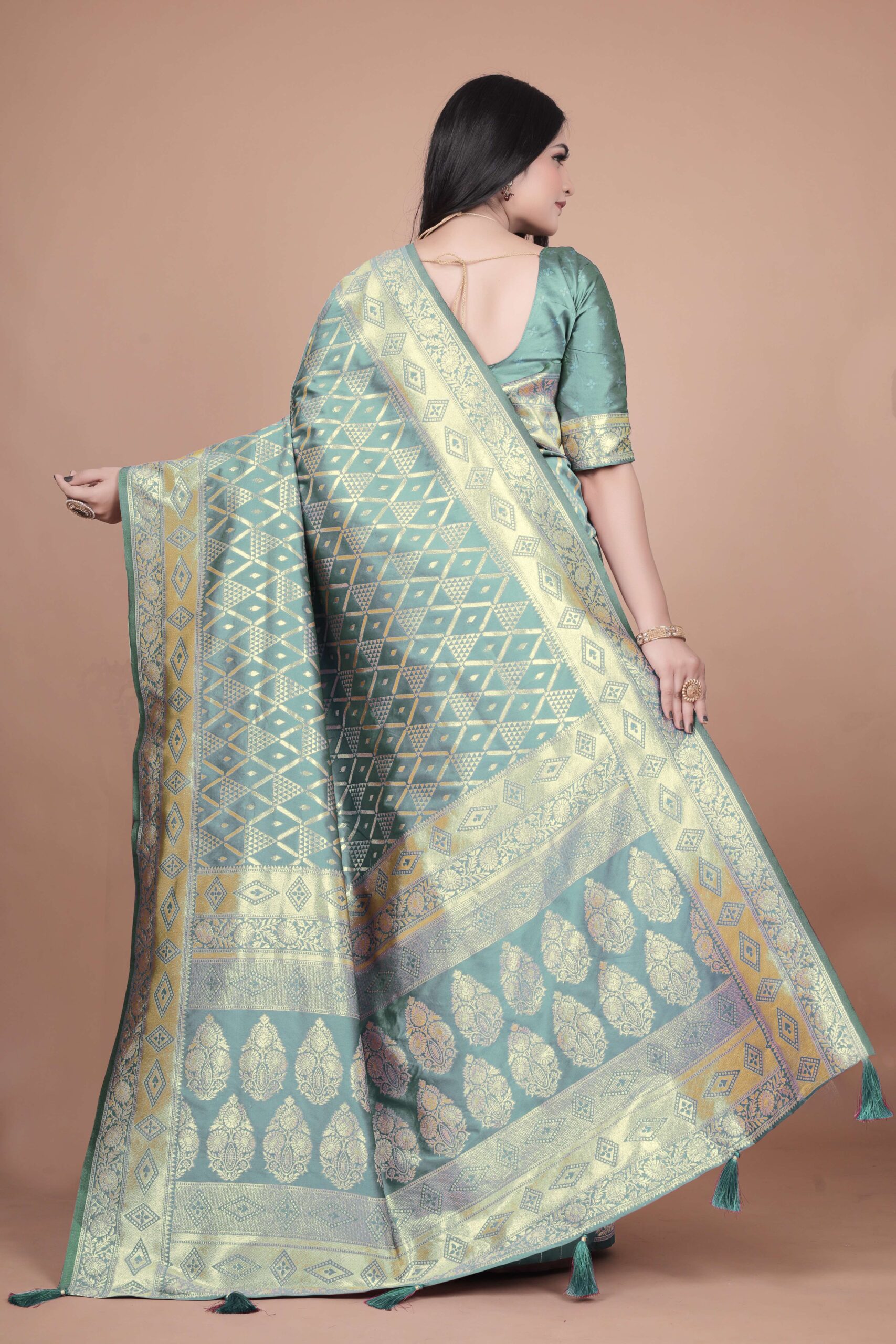 Step into the world of sophistication with this Pastel Green Banarasi Silk Saree with Golden Zari Weaving. The body of the saree is enhanced with delicate geometric diamond motifs in shimmering gold, symbolizing timeless artistry.