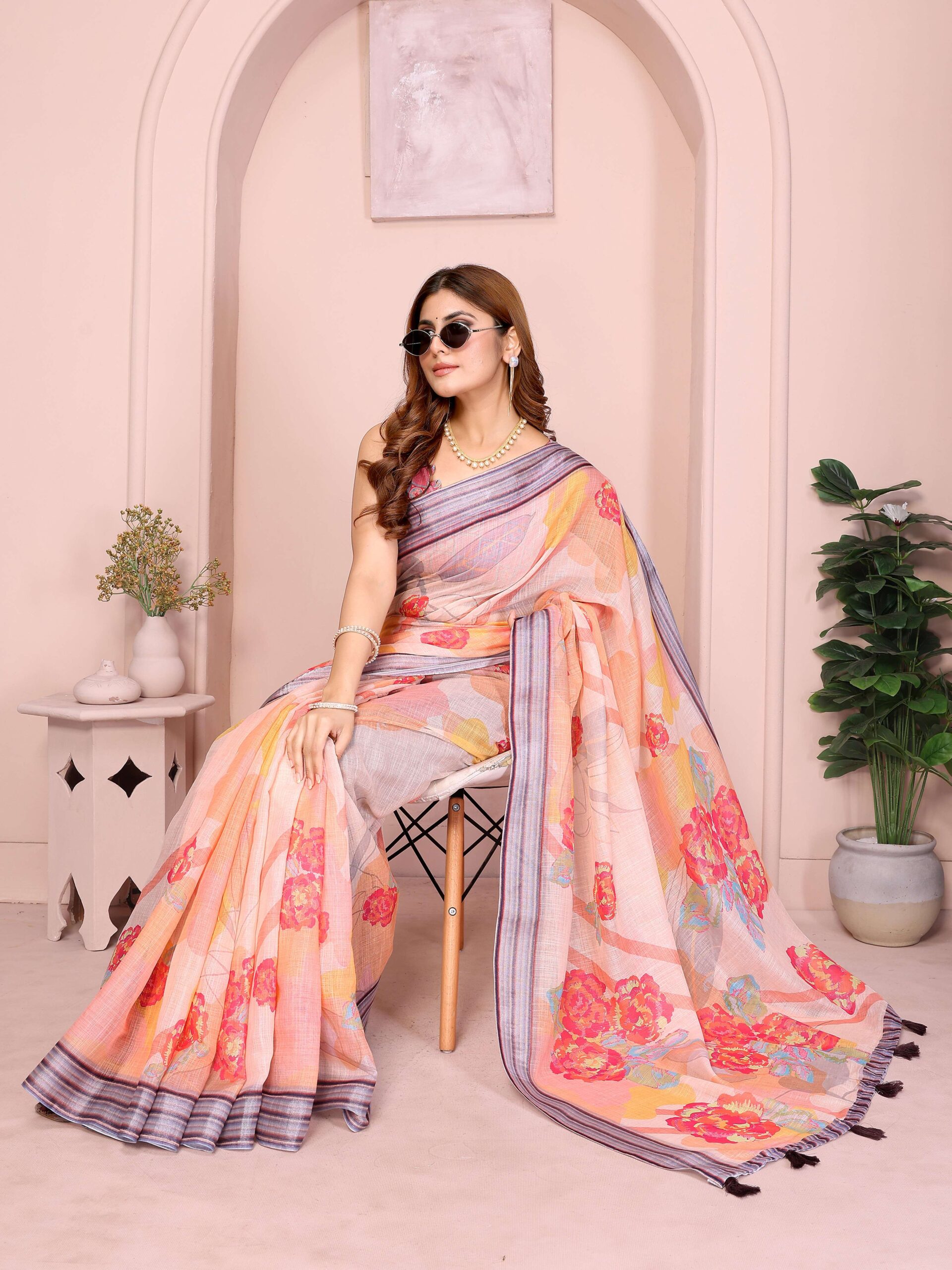 Step into effortless charm with the Peach Linen Cotton Saree, designed for both style and comfort. Crafted from soft and breathable linen cotton, this saree drapes elegantly for all-day wear. The peach base is adorned with bold floral prints in lively shades of pink, red, and yellow, creating a vibrant and eye-catching look.