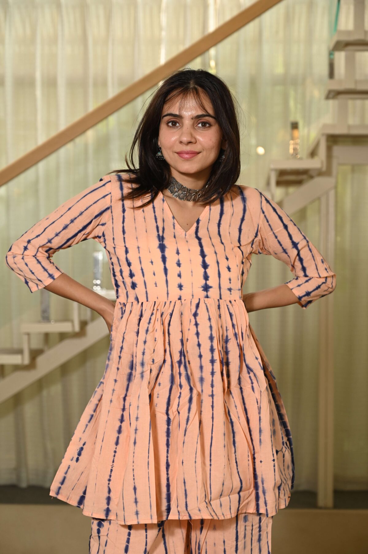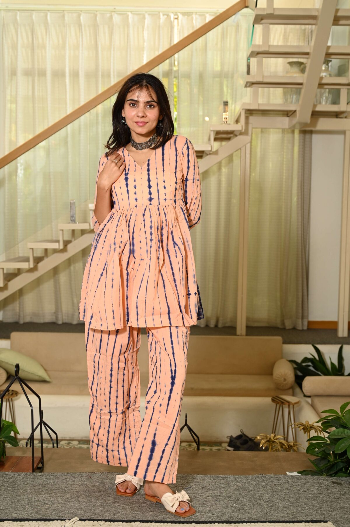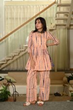 Peach Printed Block Print Cotton Co-ord Set for Women ? Peplum Kurta with Straight Pants