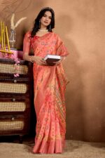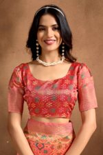 Intricately woven with Patola-inspired motifs and enhanced with vibrant multicolor detailing, the saree features a contrasting pallu and a rich zari border, giving it a regal festive appeal.