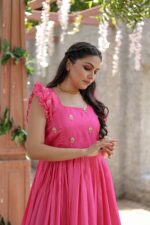 Designed with a 3.5-meter flowing flair and frill stitching, this gown ensures a graceful silhouette, while the full cotton lining provides all-day comfort. Perfect for weddings, festive gatherings, or special events, this ready-to-wear gown is a versatile addition to any wardrobe.