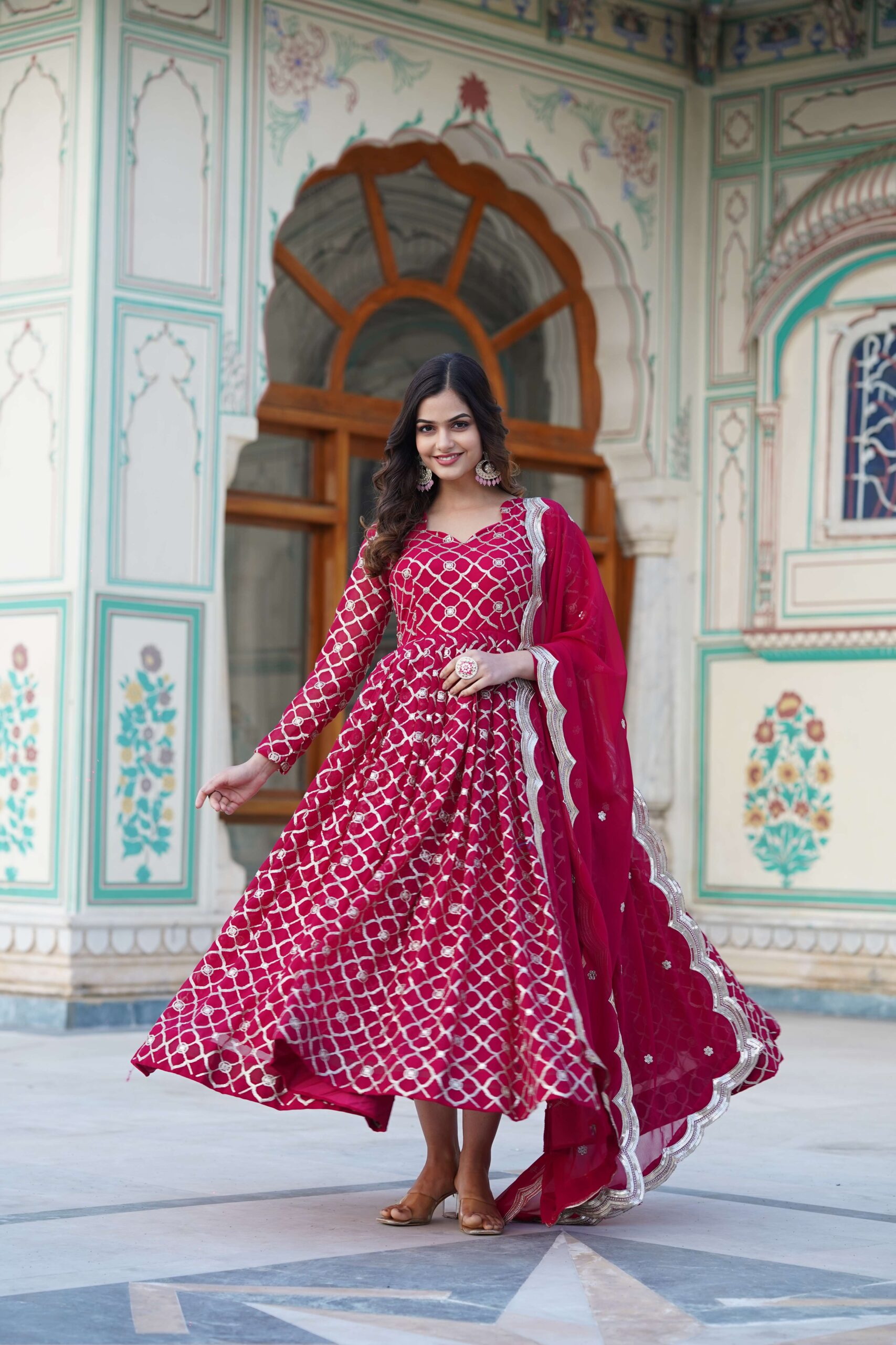 Elevate your festive and party wardrobe with this premium Faux Blooming gown-dupatta set. Crafted from high-quality Faux Blooming fabric, the gown features delicate sequins embroidery, a fancy neckline, full sleeves, and a 3.5-meter flowing flair with canvas patta stitching.