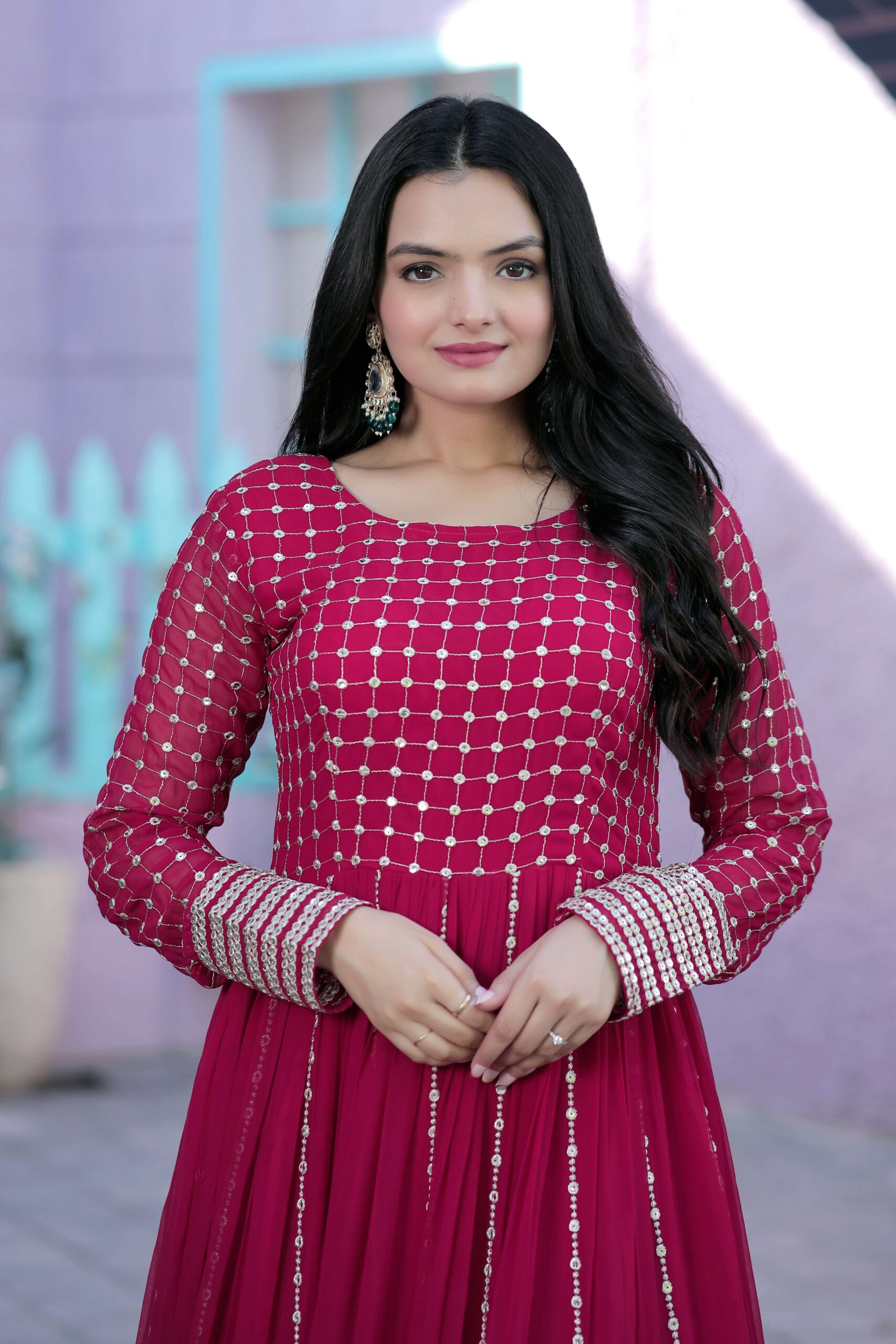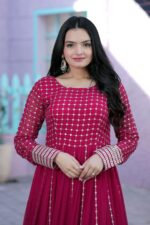 Experience the perfect blend of tradition and contemporary fashion with this exquisite Faux Blooming designer gown. Crafted from premium fabric, it is adorned with parallel-line sequins and silver zari embroidery that create a stunning visual appeal. The elegant round neck and full sleeves add a sophisticated touch, making it suitable for both festive celebrations and evening occasions.