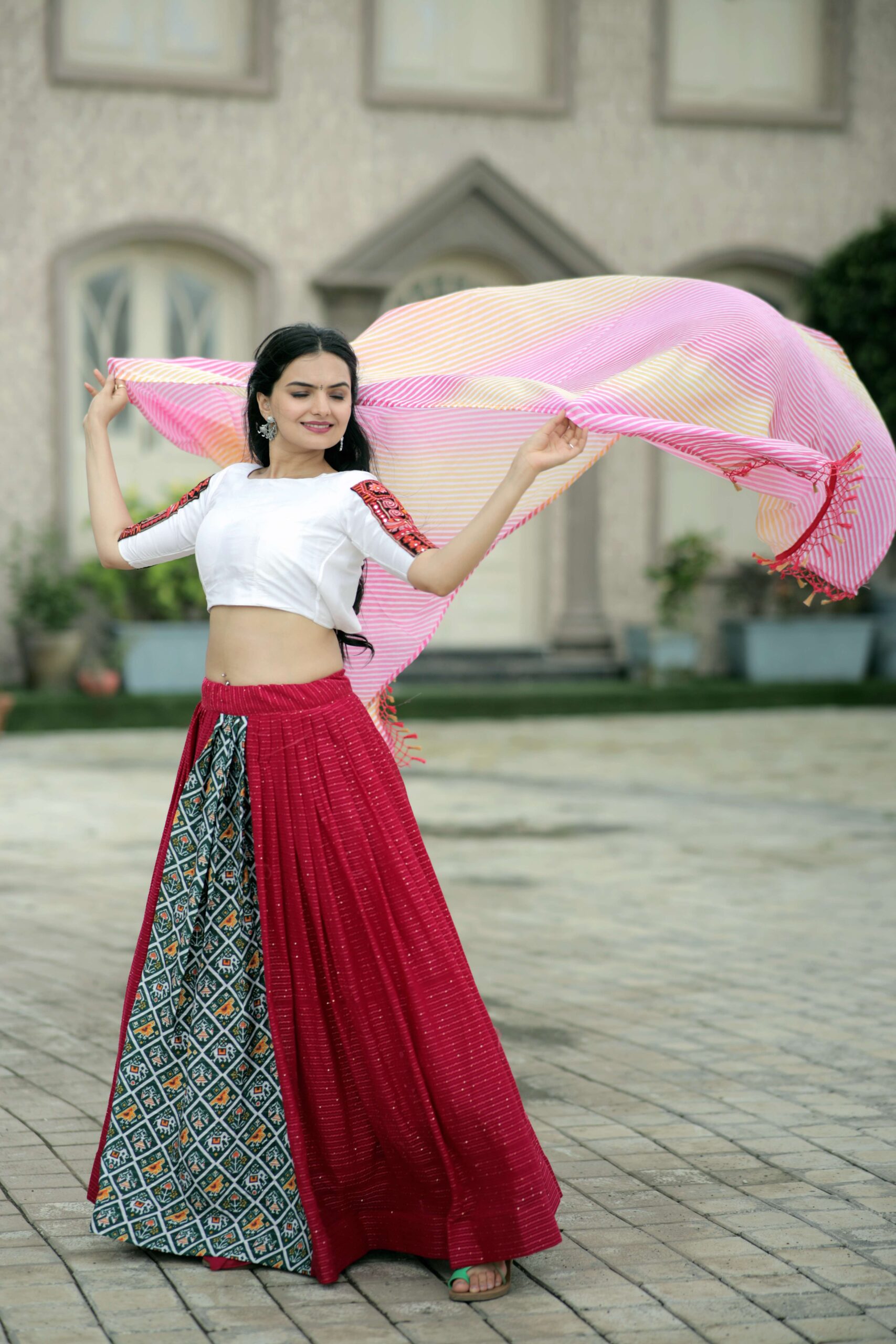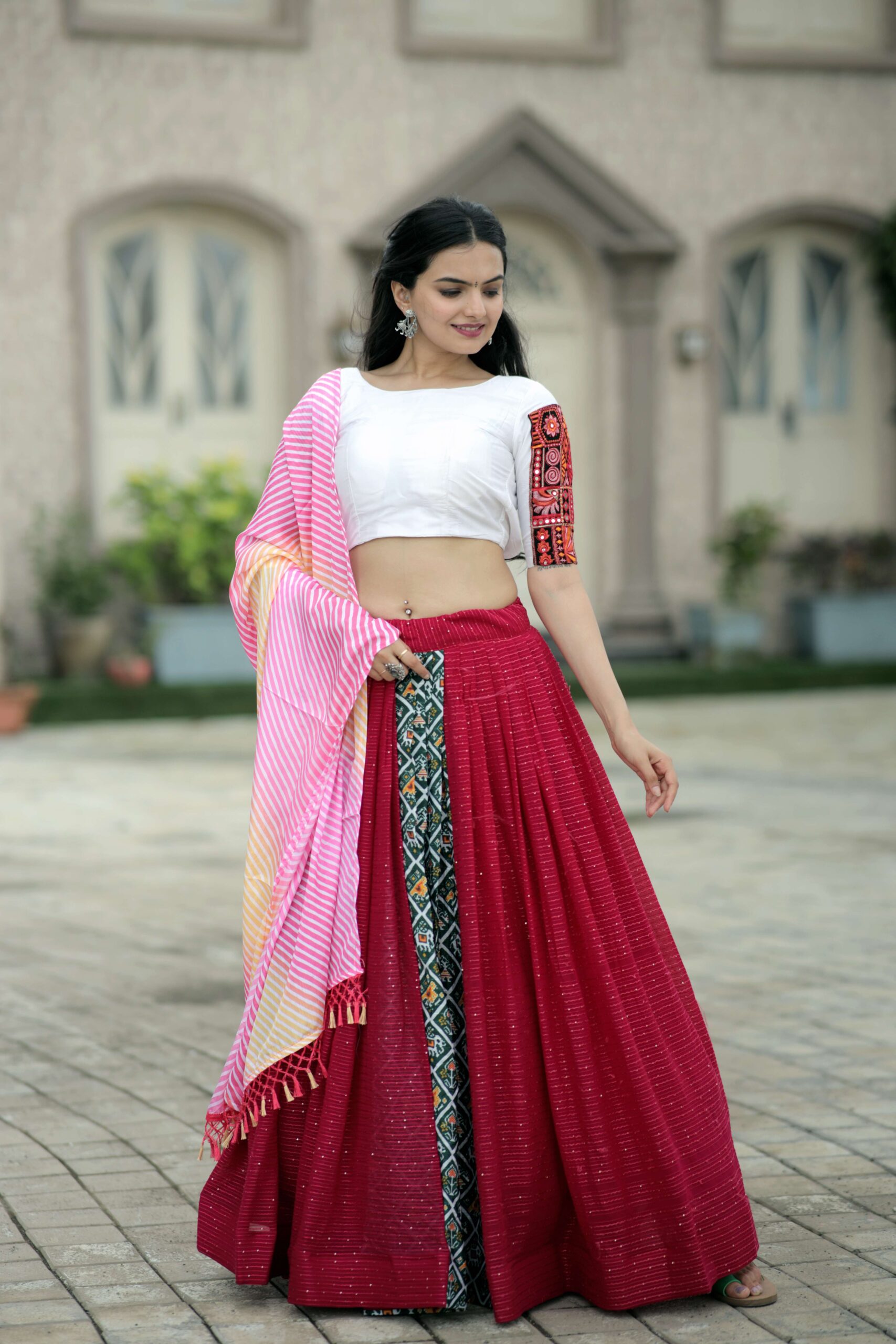 Celebrate traditions in style with this premium embroidered readymade lehenga choli dupatta set, specially designed for festive occasions like Navratri and weddings. The lehenga is made of viscose crochet fabric with position print, offering a refined and traditional look. It features a 3.5-meter flair with cotton inner lining for comfort, and is finished with a chain closure and dori latkan detail for added grace.