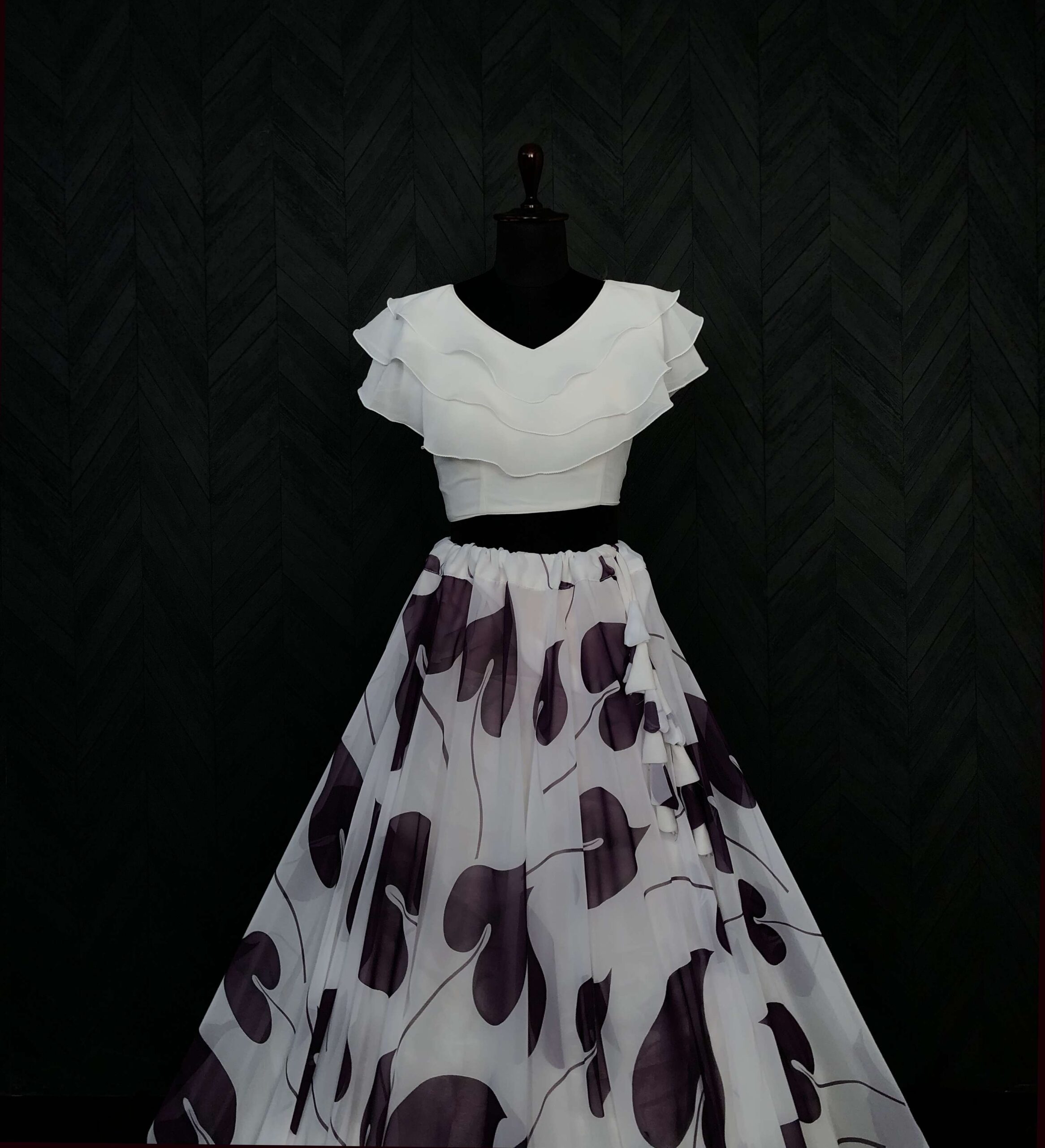 The blouse is crafted from faux georgette in a chic frill pattern, offering a fashionable twist to the classic choli. Available in two color options (Black & White), it allows you to style the set according to your preference. Stitched in size 38 with alteration possible up to 44, it ensures a comfortable and versatile fit.