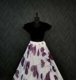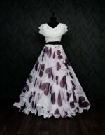 The lehenga is made from faux georgette with bold big-leaf rich digital prints, tailored with wire-picco work for a refined finish. Featuring a 5-meter flair, cotton inner lining for comfort, and a zip closure with dori latkan, it gives a graceful and flowy appearance that?s perfect for twirl-worthy looks.