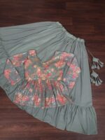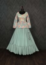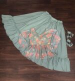 Step into elegance with this premium designer readymade lehenga choli set, crafted to blend contemporary style with traditional charm. The lehenga, tailored in faux georgette, is designed with a stylish frill-stitched finish that enhances its 5.5-meter flair for a flowing, voluminous silhouette. Soft crepe silk lining ensures comfort, while the chain closure with potli latkan adds a delicate ethnic detail.