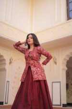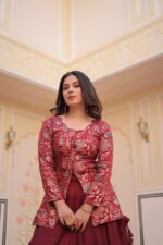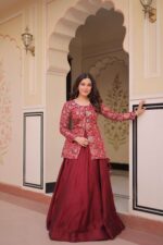 This ensemble includes a full-stitched lehenga crafted from pure simmer Vichitra, with 3.5 Mtr flair and fully lined with cotton for comfort. The lehenga features Kali pattern stitching with canvas patta and is finished with a chain closure and hexagon tassel latkan for a refined look.