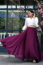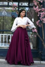 The blouse is made of luxurious phantom silk and designed with umbrella flared sleeves for a statement look. The designer collar neck (stand collar) adds sophistication, making this outfit ideal for fashion-forward women. Available in multiple sizes (S to XXL), it offers both comfort and style.