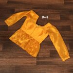 The blouse is made from luxurious mulberry silk, designed in a chic peplum style with full puff sleeves and a flattering V-neckline. Pre-stitched in size 38, it can be altered up to size 44 for a perfect fit, while the backside hook closure ensures ease of wear.