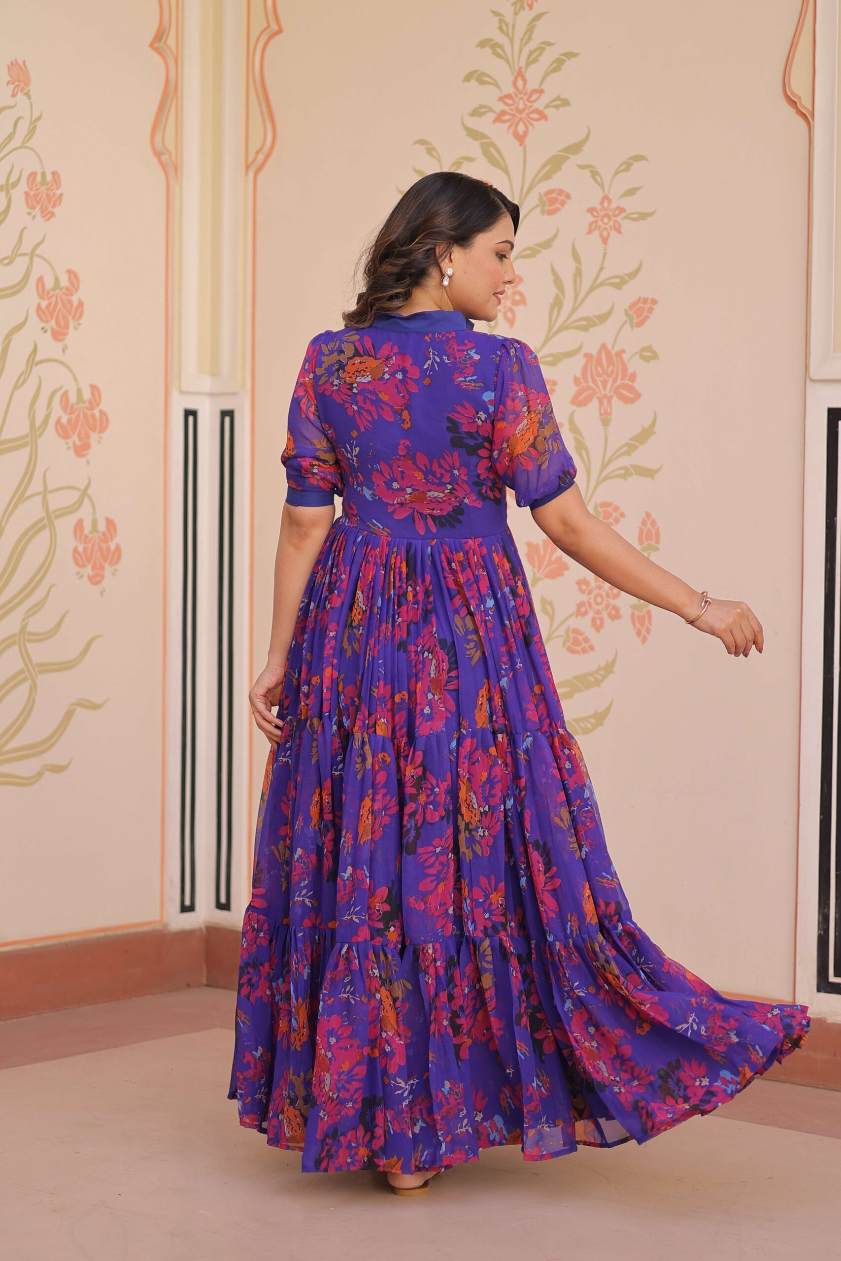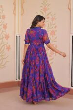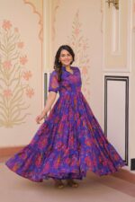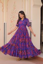 Elevate your wardrobe with this Premium Ready-Made Gown, crafted from faux georgette fabric with elegant prints. The gown features a flowy 12-meter flair, half sleeves, and a fancy V-neck collar, paired with a full cotton inner lining for comfort and elegance. Designed to flatter all body types, this gown is the perfect blend of style and sophistication.