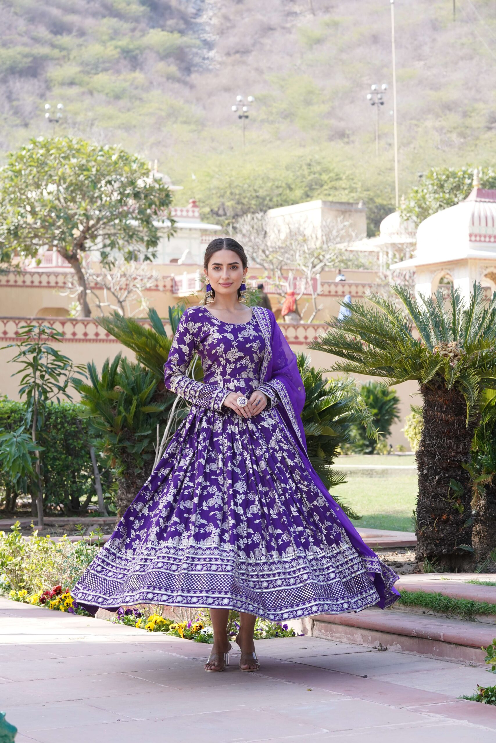 Purple Viscose Dyable Jacquard Gown with Russian Silk Sequined Dupatta ? Elegant Party & Wedding Set