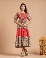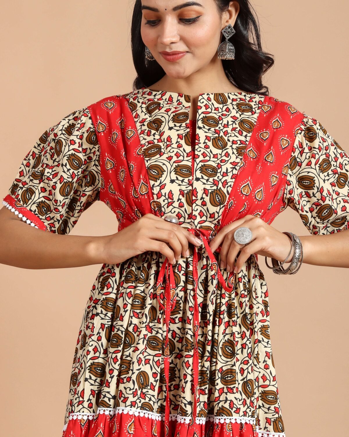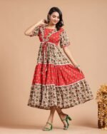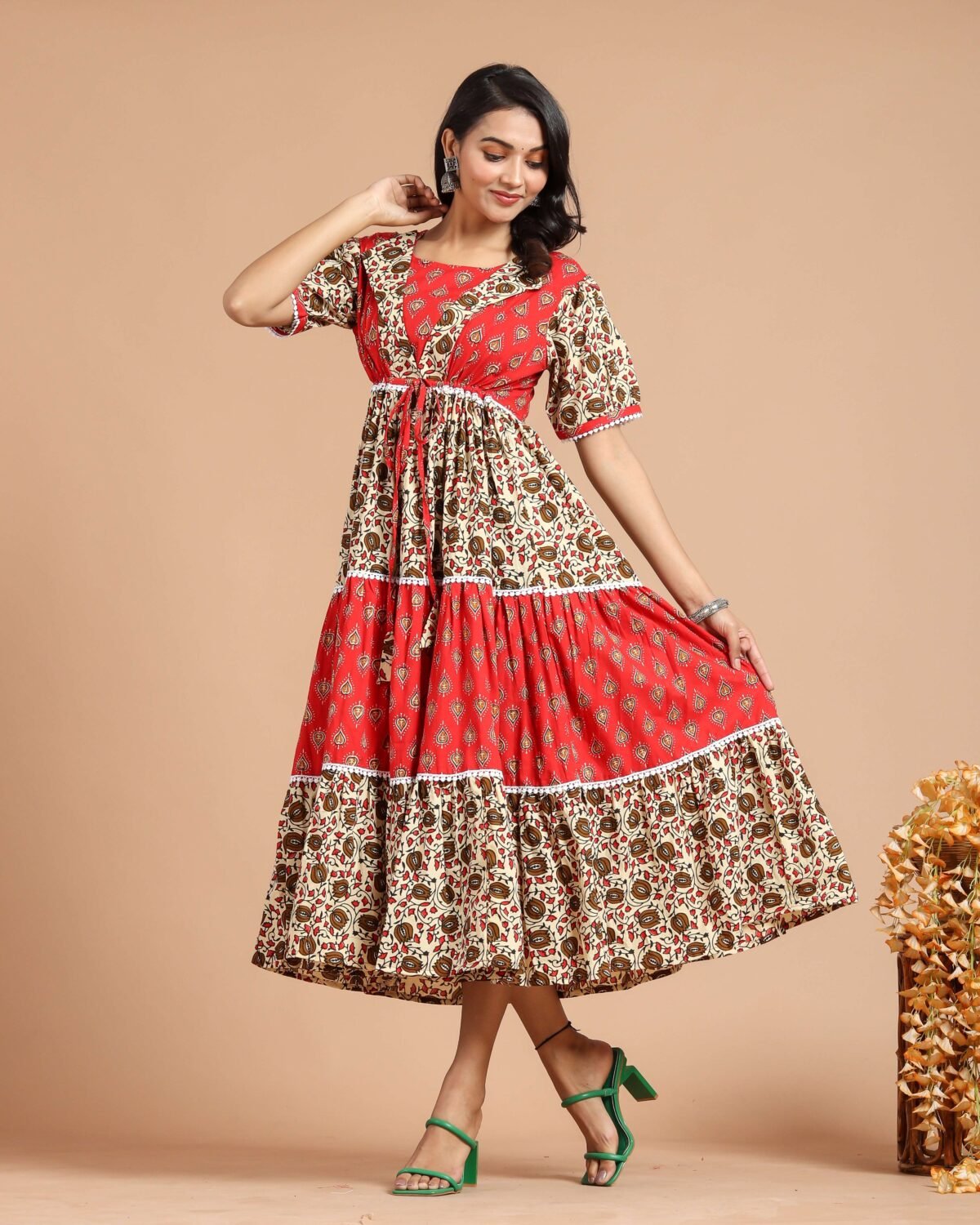 Red & Beige Printed Tiered Maxi Dress with Short Sleeves & Waist Tie ? Ethnic Boho Fusion Wear