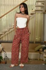Elevate your casual wardrobe with these red cotton straight pants for women, adorned with delicate white floral prints that give them a timeless charm. Made from breathable cotton, these pants feature a relaxed fit, elastic waistband, and functional side pockets for maximum comfort. Perfect for pairing with kurtas, tops, or crop shirts, they are ideal for lounging, travel, or daily outings.