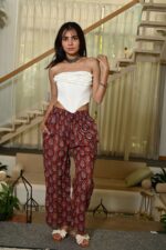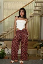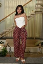 Bring a touch of ethnic charm to your wardrobe with these red cotton straight pants for women, beautifully adorned with traditional handblock prints in blue and white motifs. Crafted from breathable cotton, these pants offer a relaxed fit with an elastic waistband, ensuring comfort throughout the day. The addition of side pockets makes them both fashionable and functional. Pair them with kurtis, tops, or crop shirts for a versatile casual look.