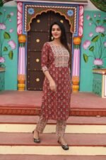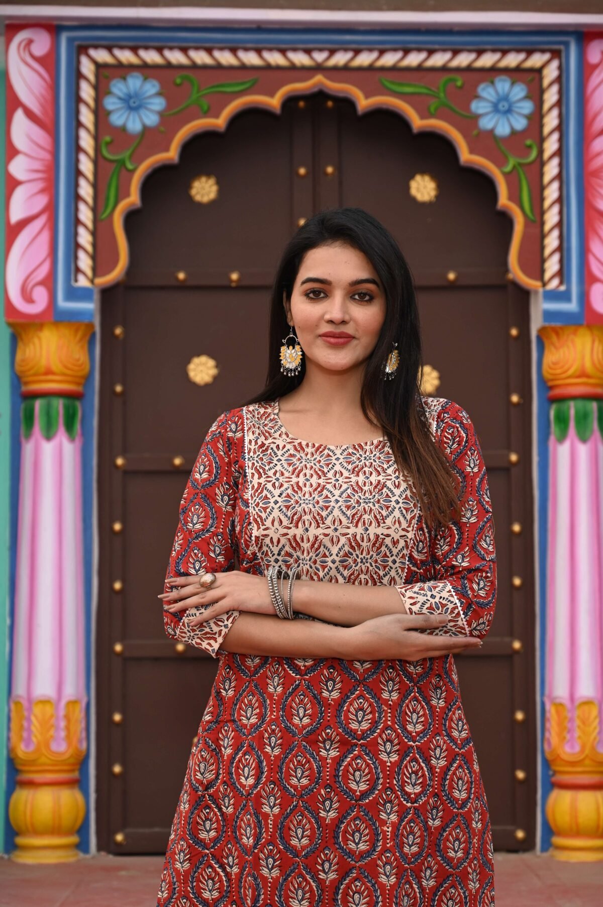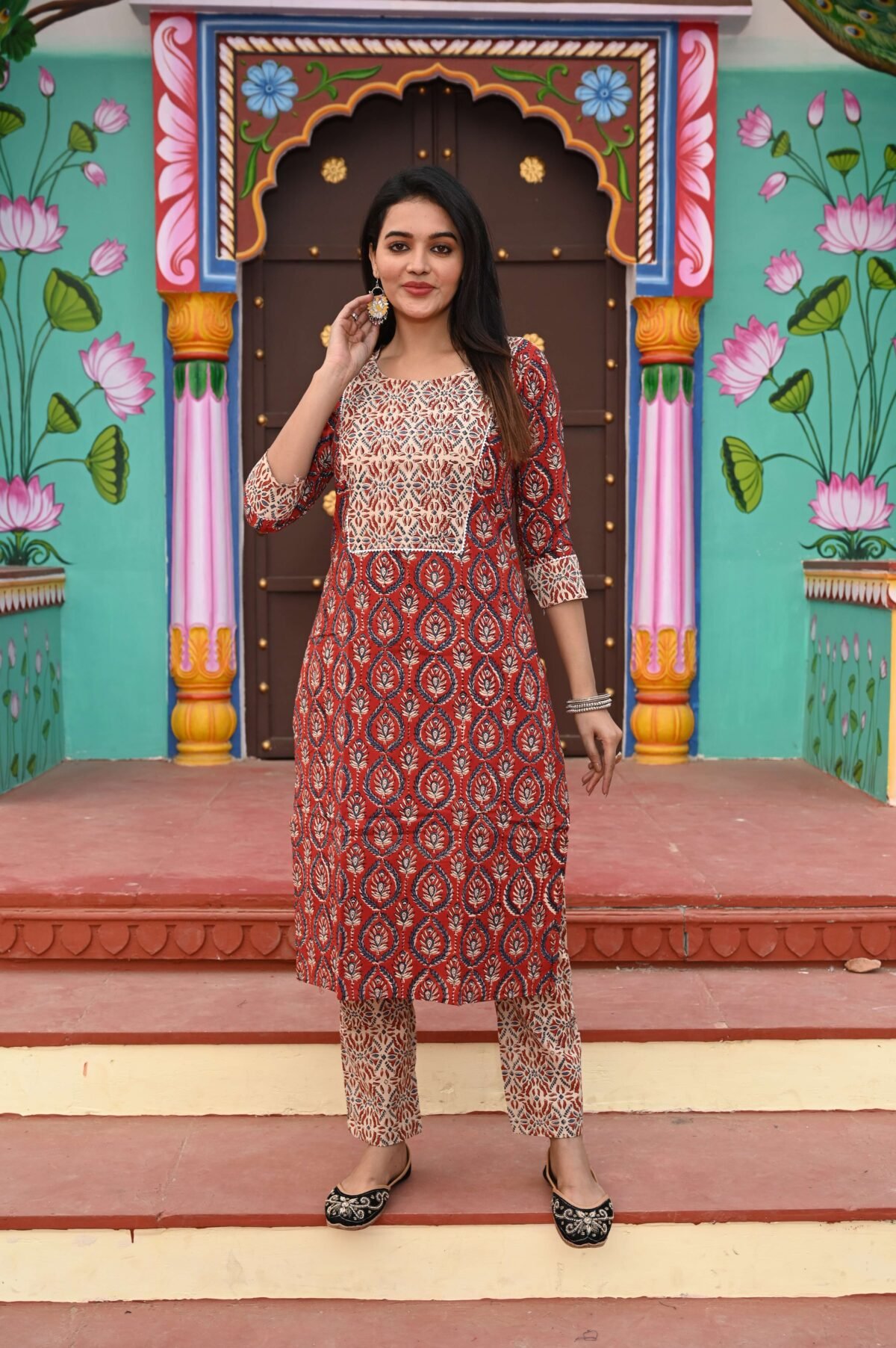 red cotton kurta set, designed with traditional block-inspired prints and a unique cream patchwork yoke detail. The kurta features a straight fit, 3/4th sleeves, and a round neckline that complements its vibrant design. Paired with cream straight pants featuring red prints, this set offers the perfect balance of elegance and comfort.