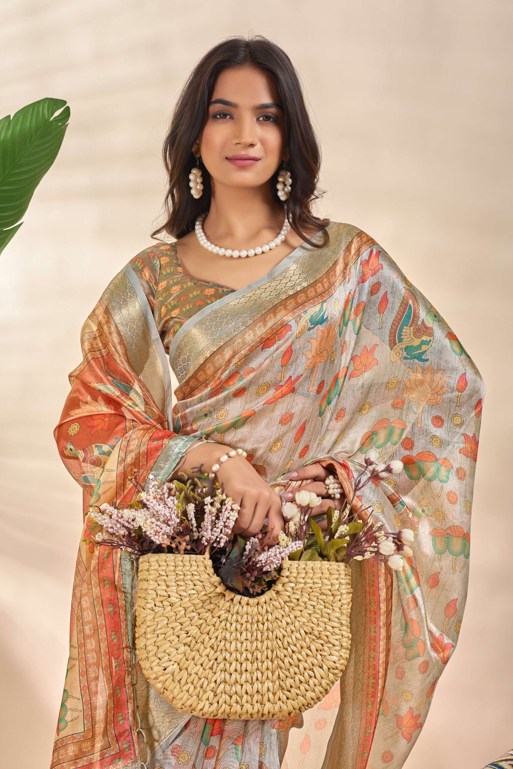 Drape yourself in timeless elegance with this exquisite soft silk saree, featuring a mesmerizing lotus and peacock print. The delicate floral motifs combined with graceful zari detailing add a regal touch, perfect for any festive or traditional occasion.