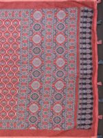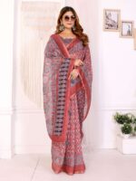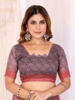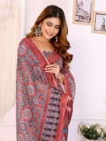 Step into elegance with the Rust Red Traditional Printed Chanderi Saree. Crafted from premium Chanderi fabric, this saree showcases a rich rust red base adorned with intricate black and white traditional prints, highlighted by a finely detailed ethnic border.