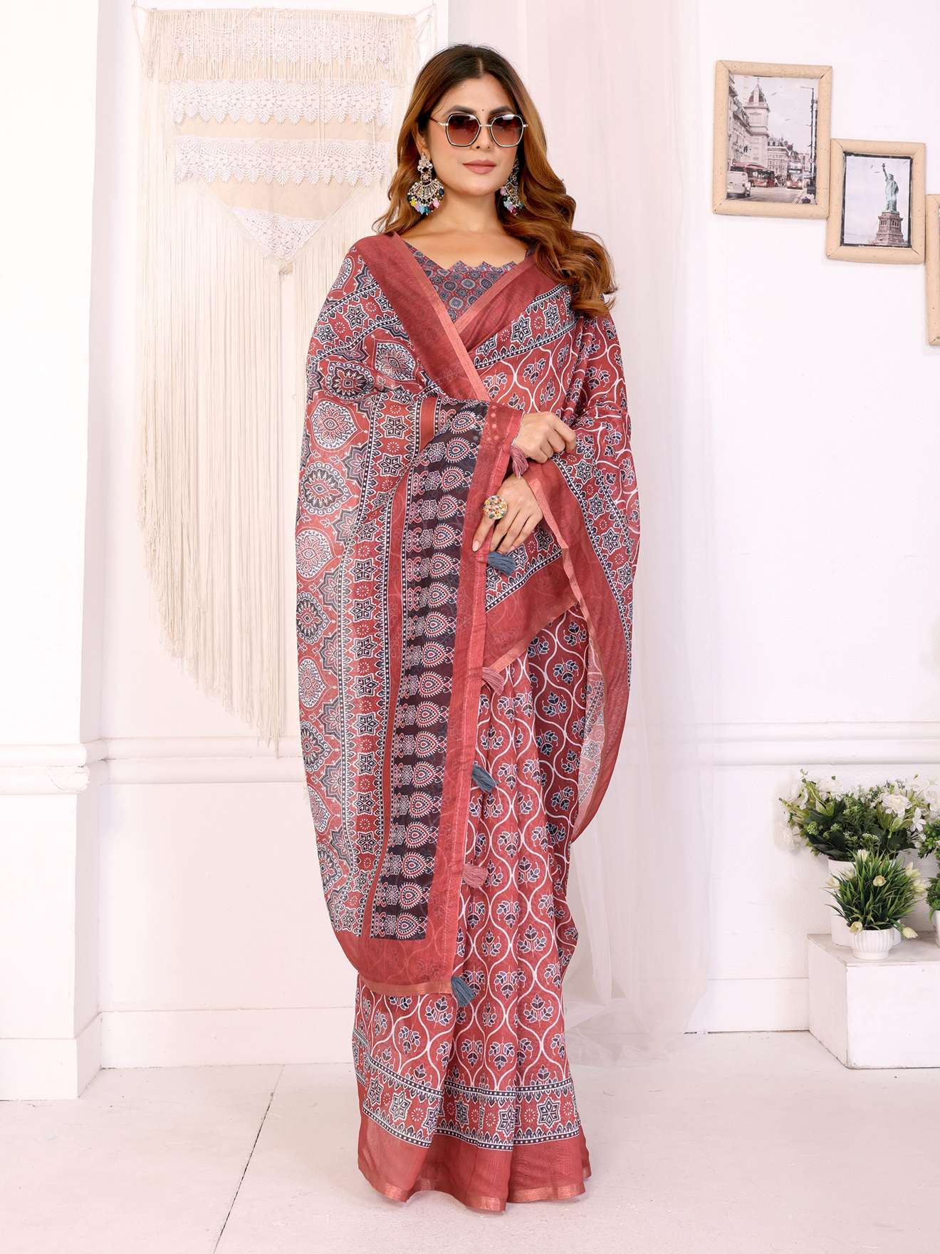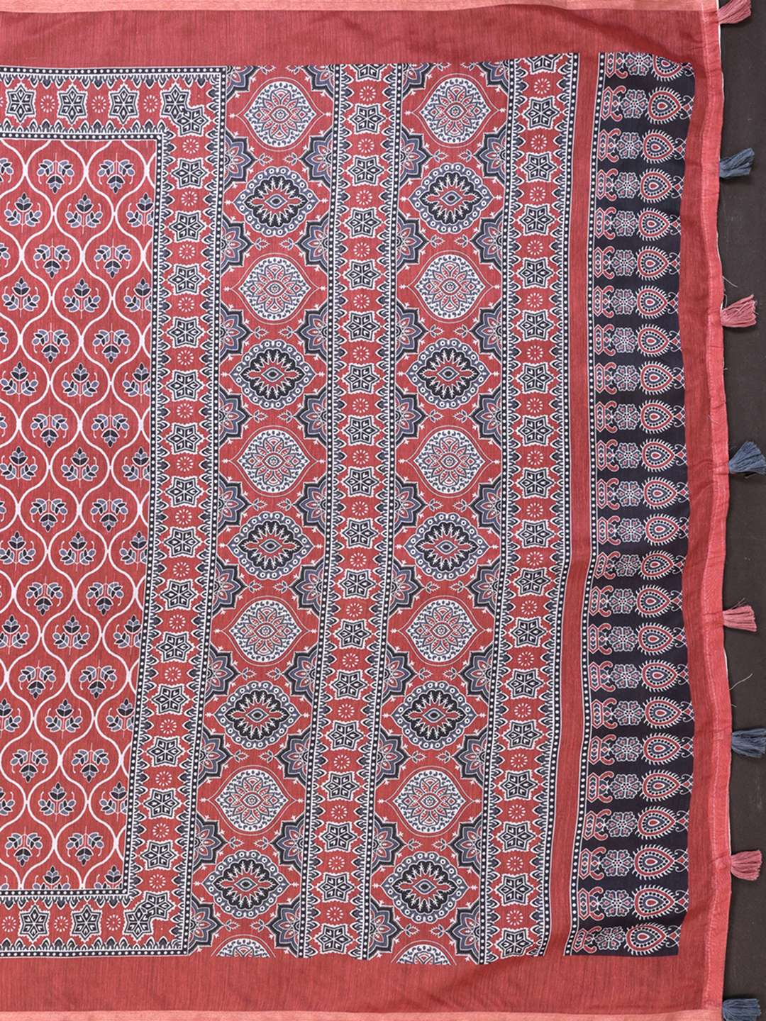 Rust Red Chanderi Saree with Black & White Traditional Prints ? Elegant Festive Wear