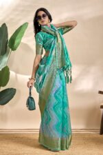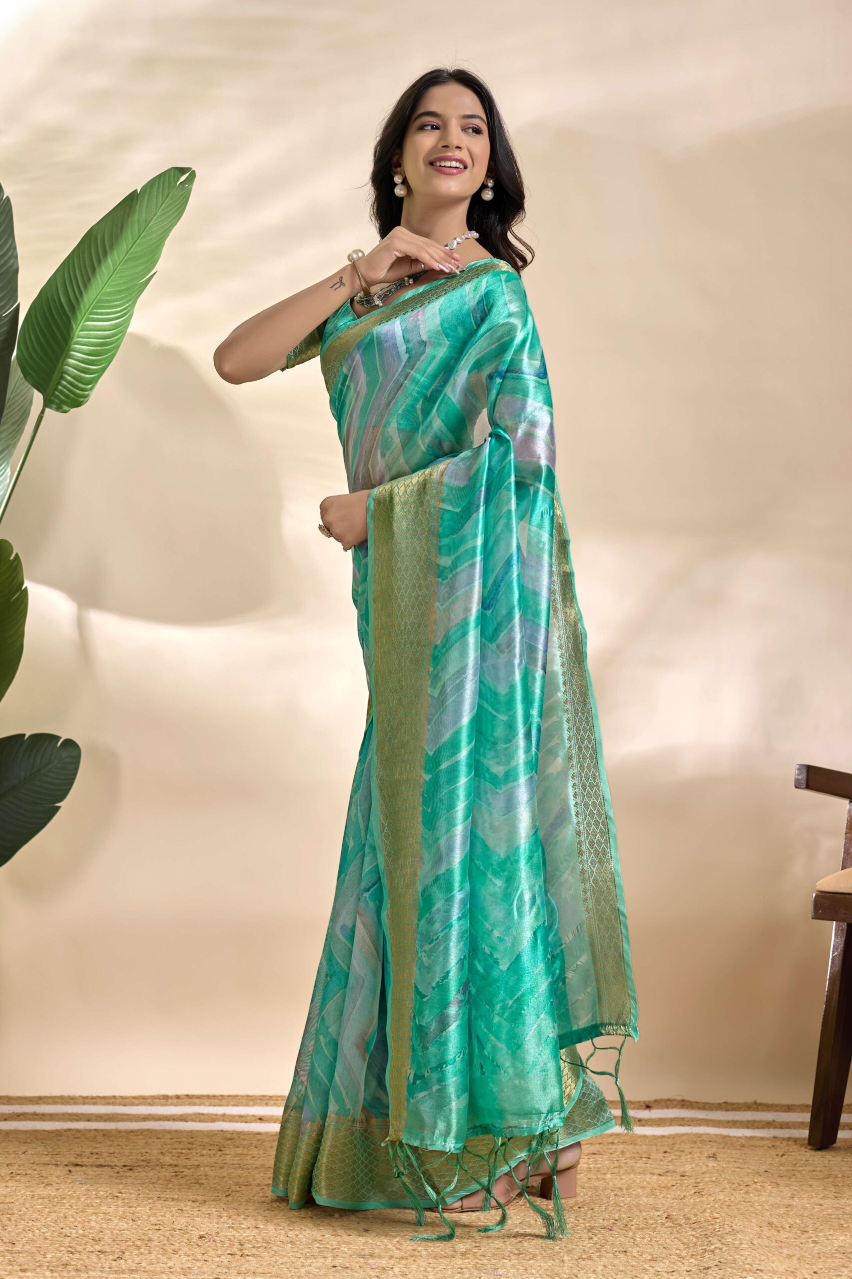 Gracefully crafted in a serene sea green hue, this soft silk blend saree features a flowing wave-inspired pattern that exudes elegance and sophistication. The smooth drape enhances its charm, while the shimmering zari border adds a refined traditional touch.