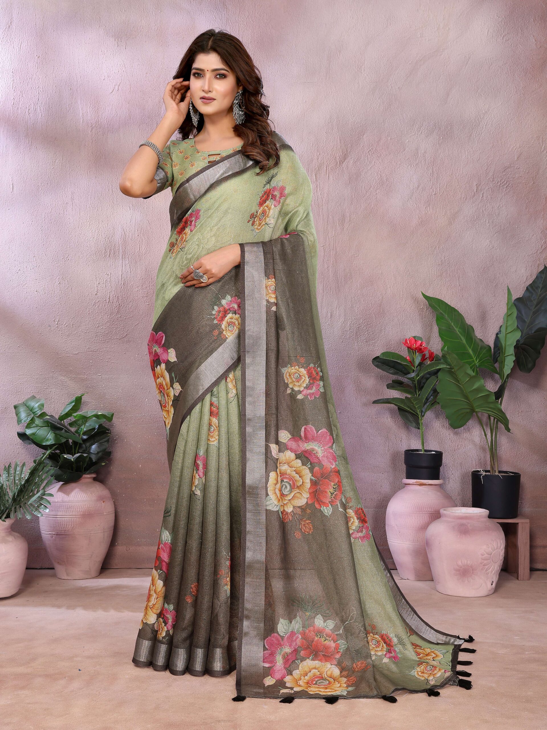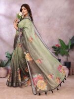 Adorn yourself in the exquisite elegance of this Serene Green Floral Printed Saree. This beautiful piece features a soft green base with a subtle shimmer texture, offering a light and comfortable drape. The main body of the saree showcases a simple, refined elegance, while the pallu is a true work of art. It features a stunning contrasting fabric with a lustrous sheen, which is beautifully adorned with large, vibrant floral prints in shades of pink, orange, and red.