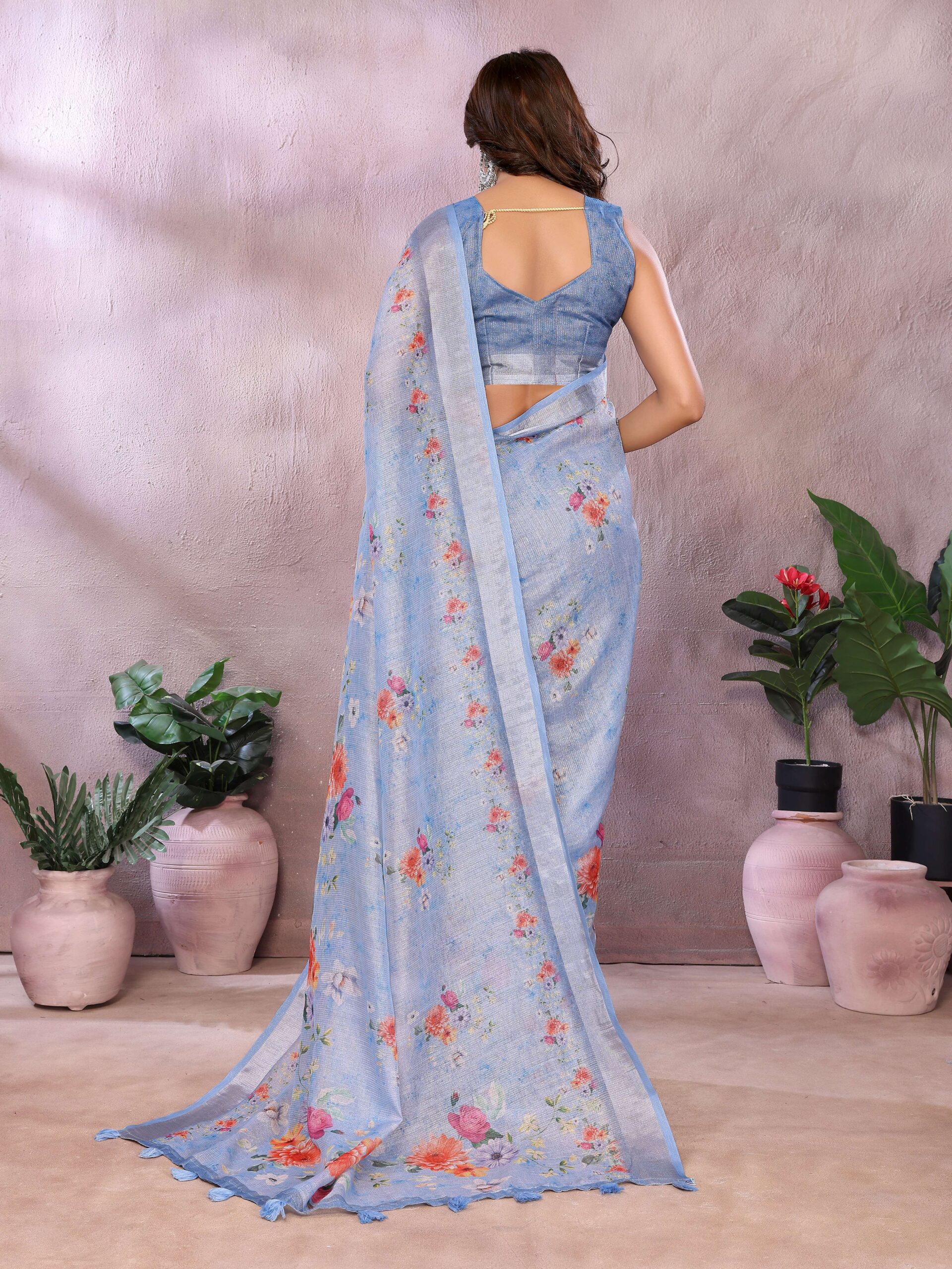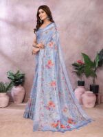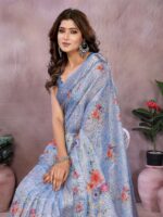 Wrap yourself in the serene elegance of this Sky Blue Floral Printed Saree. Made from a luxurious and lightweight linen shimmer fabric, this saree drapes beautifully and is exceptionally comfortable to wear. The soft sky blue base is adorned with a delicate array of multicolor floral prints in soothing pastel tones, creating a refreshing and feminine look.
